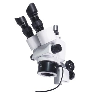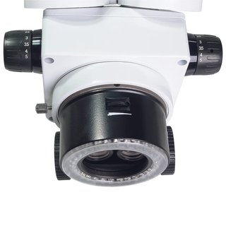 Стереоскопическая головка МС-4-ZOOM (тринокуляр) предназначена для проведения исследований в отраженном свете с помощью встроенного кольцевого осветителя. Осветитель создает освещение со спектром, близким к дневному свету - подобный свет способствует правильной цветопередаче и упрощает настройку WB при использовании камеры. В осветителе использованы 30 светодиодов общей мощностью 3Вт, расположенные вокруг объектива. Благодаря такой конфигурации создается равномерное освещение объекта без ассиметричных косых теней препятствующих проведению точных измерений размеров объекта и получению ложных результатов исследований. Осветитель имеет бесступенчатую регулировку яркости.