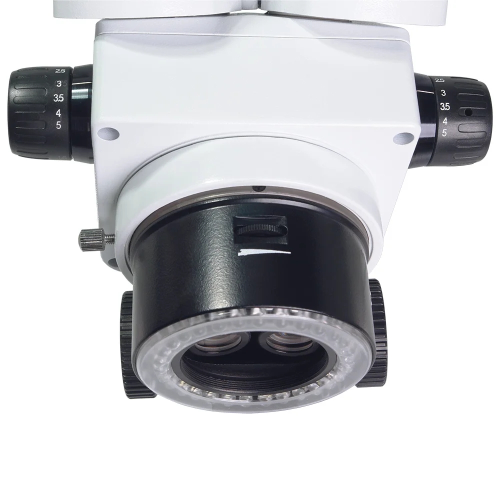 Максимальное рабочее расстояние 177 мм достигается при использовании насадки 0.5х, размер поля зрения при этом составит 62 мм, общее увеличение 3.7х - 25х. Максимальное увеличение достигается с насадкой 2х, при этом рабочее расстояние составит 33 мм при размере поля зрения 2.3 - 15.5 мм.
