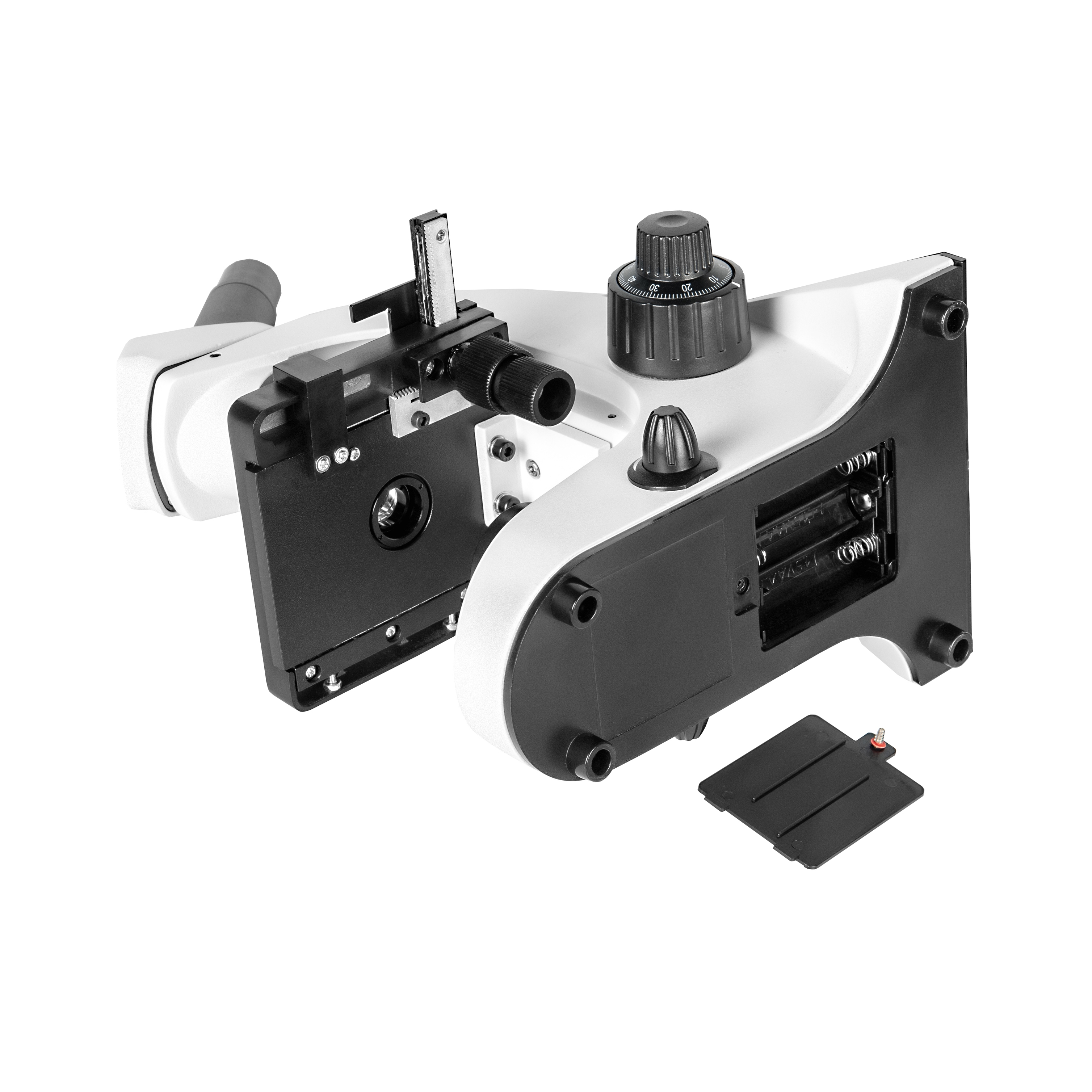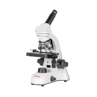 Микроскоп оснащен монокулярной визуальной насадкой, допускающей поворот вокруг оптической оси на 360°, что позволяет установить ее в удобное для работы положение. Поворотная конструкция позволяет настраивать рациональное положение окулярного тубуса при манипуляциях с исследуемым образцом, что особенно удобно в учебном процессе при наблюдении несколькими учащимися одновременно. Угол наклона окулярного тубуса составляет 45°.