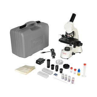 В комплект микроскопа входят объективы с ахроматической коррекцией 4x, 10x, 40x и 100х. Объектив 100х предназначен для работы с масляной иммерсий. Объективы 40x и 100х имеют подпружиненную конструкцию, что препятствует повреждению объектива и изучаемого образца. Объективы относятся к биологическим и скорректированы на стандартное покровное стекло толщиной 0.17 мм.