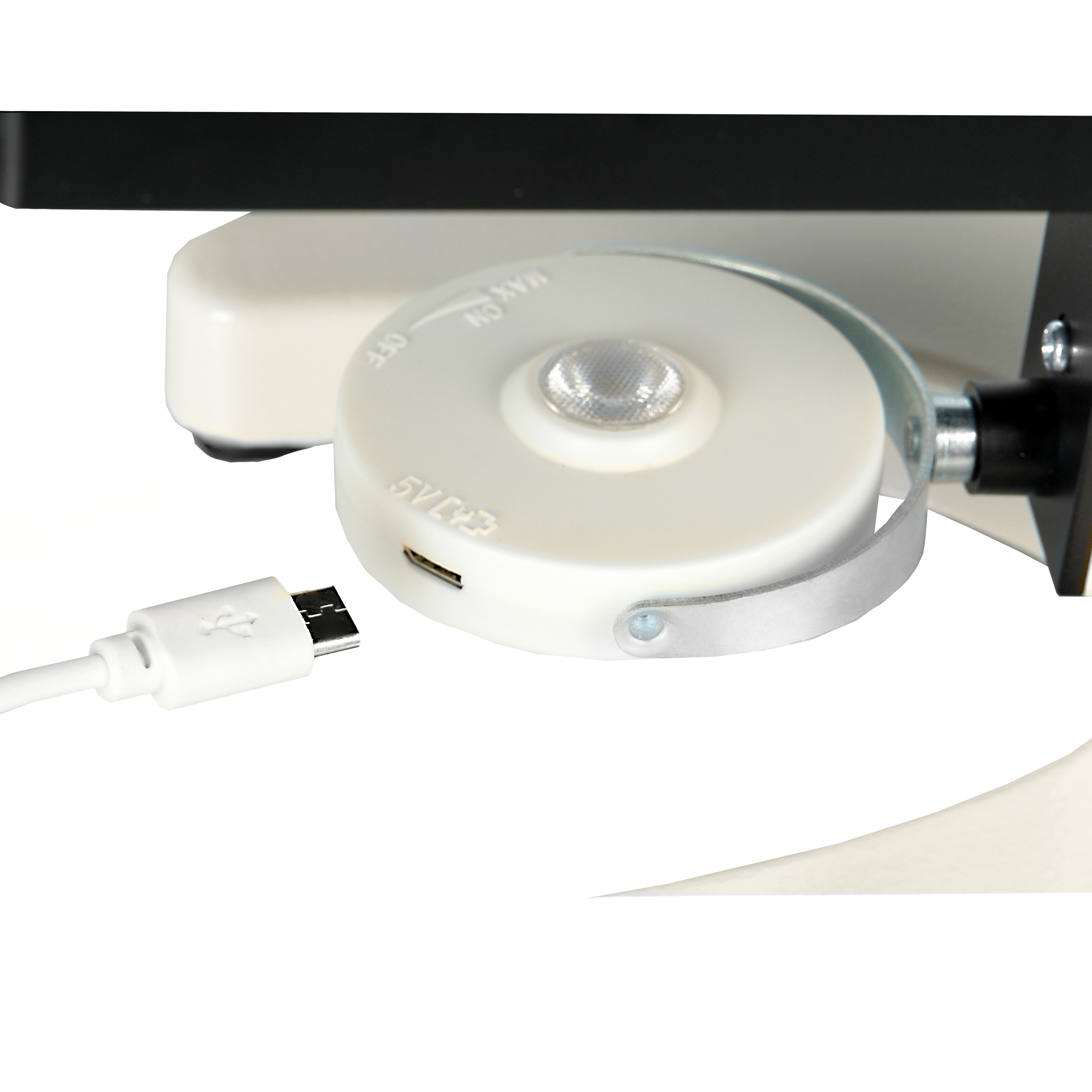 Для освещения исследуемого препарата используется поворотное зеркало со светодиодной подсветкой от встроенного аккумулятора. Микроскоп оборудован предметным столиком с механическим держателем для точного перемещения препарата во взаимно – перпендикулярных направлениях. С помощью микроскопа можно изучать срезы тканей, мазки, прозрачные минералы, кристаллы и многое другое.