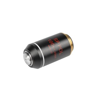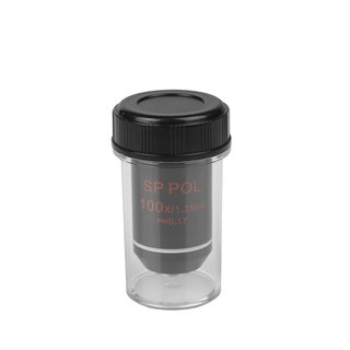 Объектив SP POL 100х/1.25 oil беск/0.17 (DIN) предназначен для исследований в поляризованном свете на микроскопах, поддерживающих установочный стандарт DIN, имеющих парфокальную высоту 45 мм, посадочный диаметр объектива 20,1 мм и длину тубуса «бесконечность». Объектив используется для исследования образцов с покровным стеклом толщиной 0,17 мм. Рабочее расстояние – 0,18 мм.