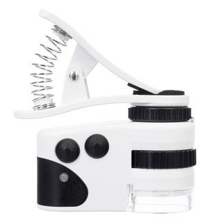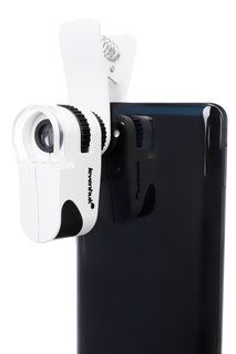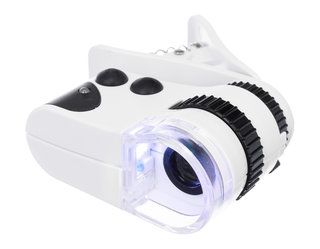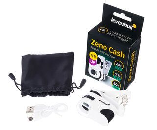 Оптика модели Levenhuk Zeno Cash ZC8 дает увеличение в 60 крат. Микроскоп можно использовать как мощную лупу: наряду с ультрафиолетовым светодиодом в подсветке есть и классический. Кроме того, устройство можно зафиксировать на мобильном телефоне напротив камеры – в этом случае увеличенное изображение можно будет наблюдать на экране и записывать. Обе подсветки работают от встроенного литий-ионного аккумулятора, время непрерывной работы составляет 8–10 часов. Зарядить прибор можно от компьютера или от сети (сетевой адаптер приобретается отдельно).