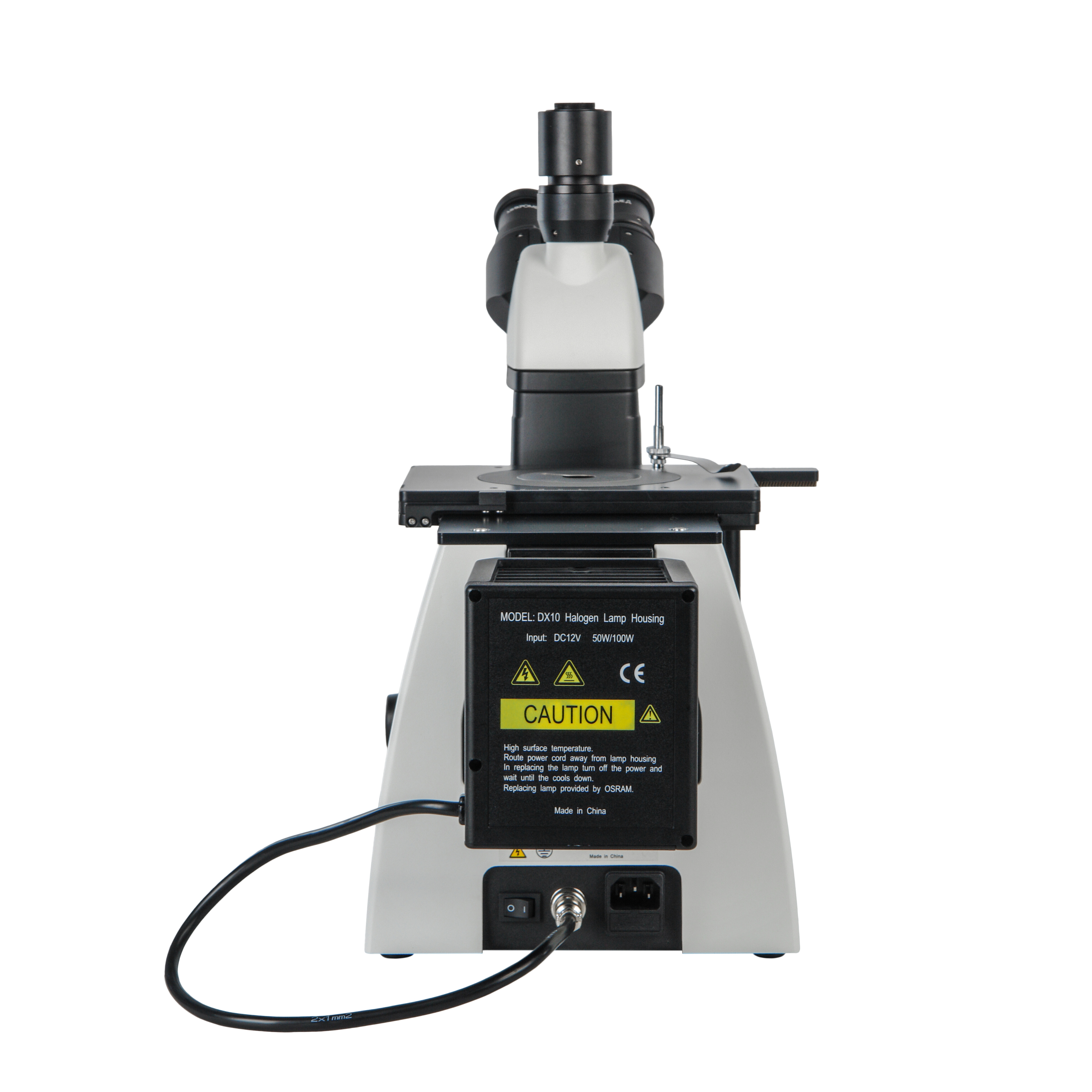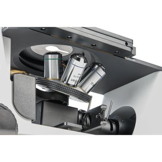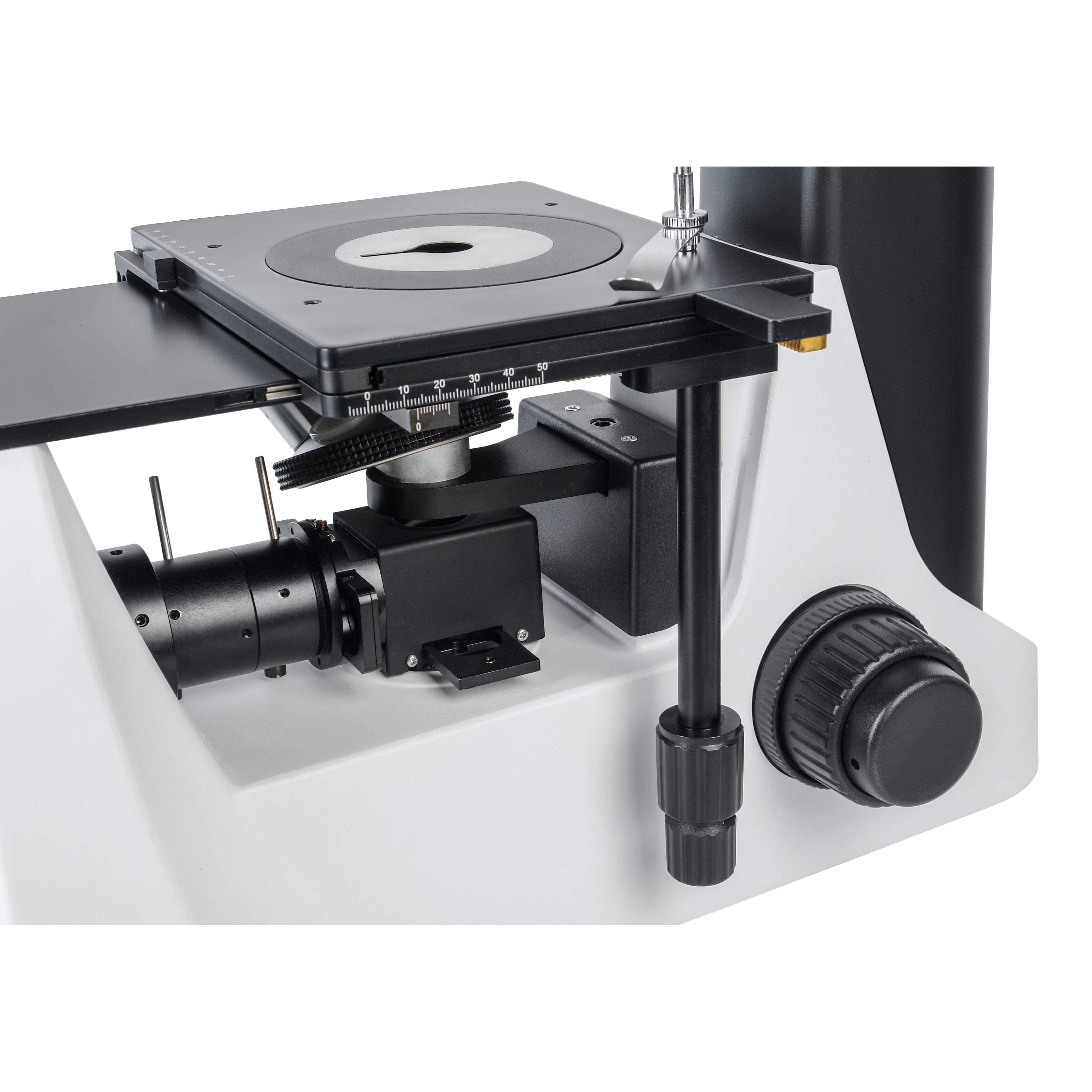 Инвертированная конструкция микроскопа предназначена для исследования габаритных объектов, поэтому предметный столик неподвижен, и фокусировка осуществляется перемещением по вертикали револьверного устройства с объективами.