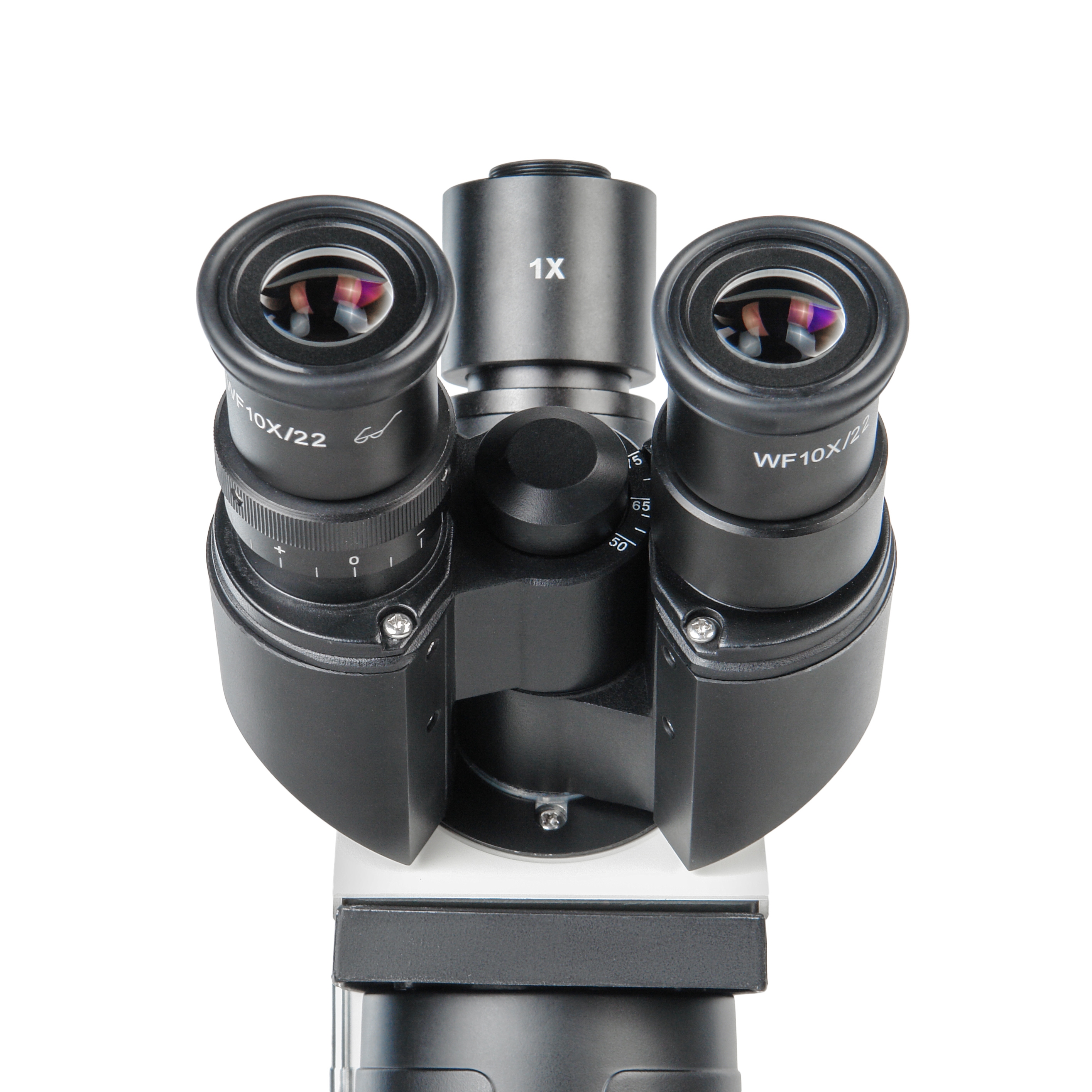 В комплект микроскопа входят окуляры широкого поля WF 10х/22 мм и окуляр WF 10х/20 с измерительной шкалой. Дополнительно к микроскопу могут быть приобретены окуляры WF 5х/18 и WF 16х/13 Plan с исправленной кривизной поля. Общее увеличение с дополнительной оптикой составляет от 25х до 1600х. Все окуляры имеют вынесенный выходной зрачок, благодаря этому возможно полноценное использование микроскопа наблюдателем в очках.