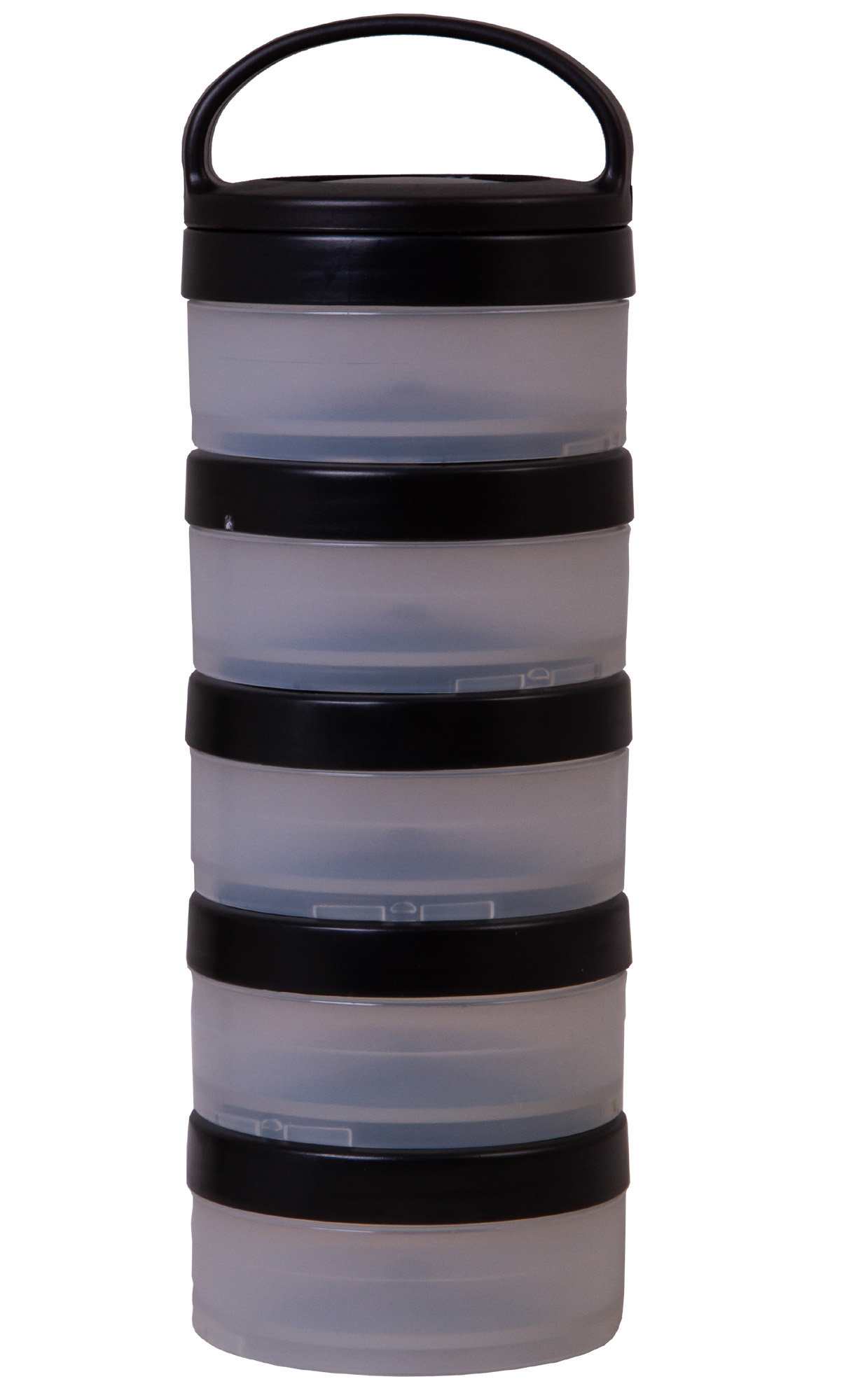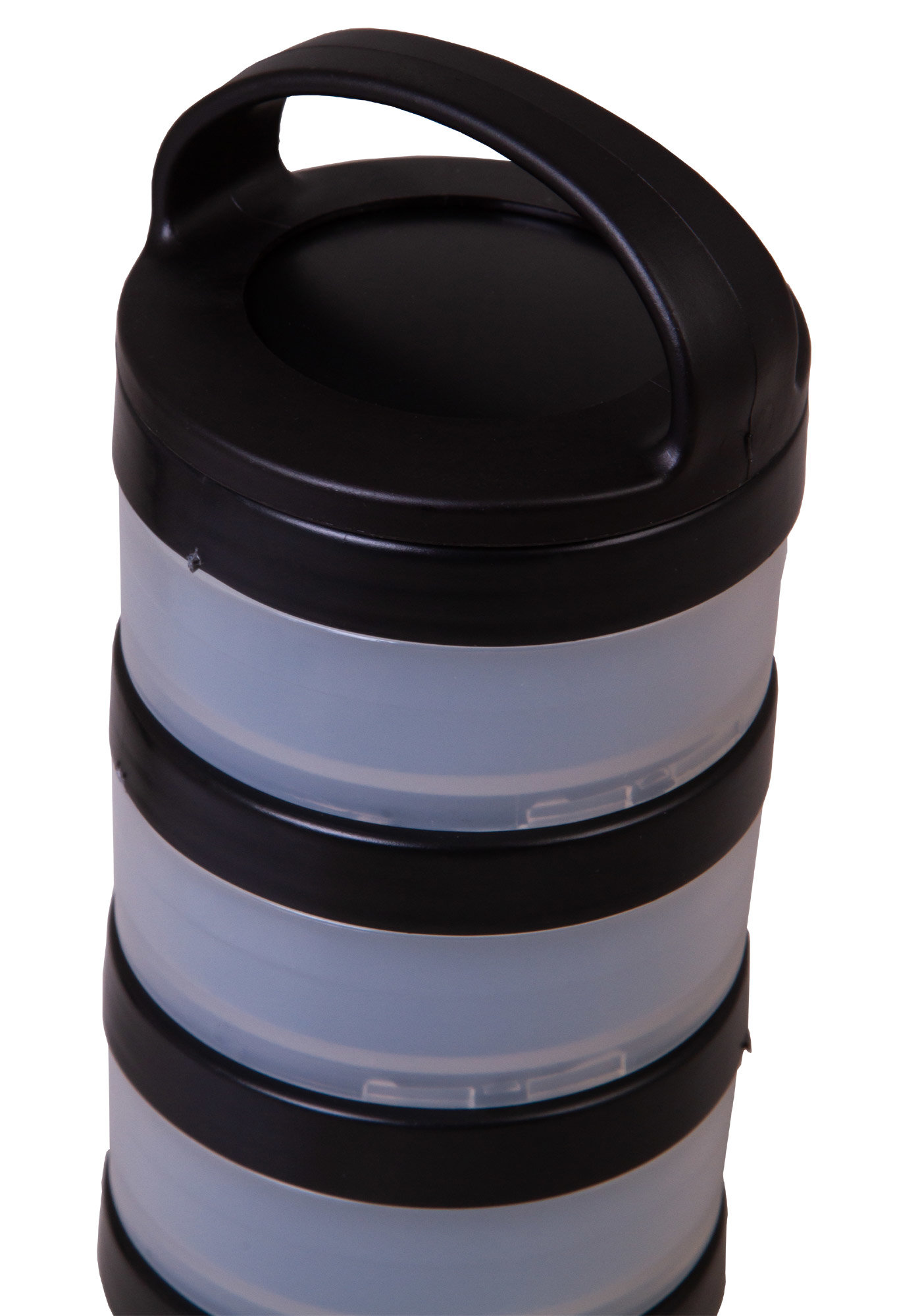 Контейнеры можно собирать в «башню» и переносить при помощи съемной ручки. Каждый контейнер снабжен отвинчивающейся крышкой.
