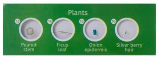 В наборе 12 образцов, среди них части растений, волокна ткани и бумаги и другое. Препараты сгруппированы по 4 штуки и размещены на 3 слайдах. Слайды оклеены цветной бумагой с круглыми окошками. В каждом окошке виден один препарат, все они подписаны. Набор упакован в красочную коробку из плотного картона.