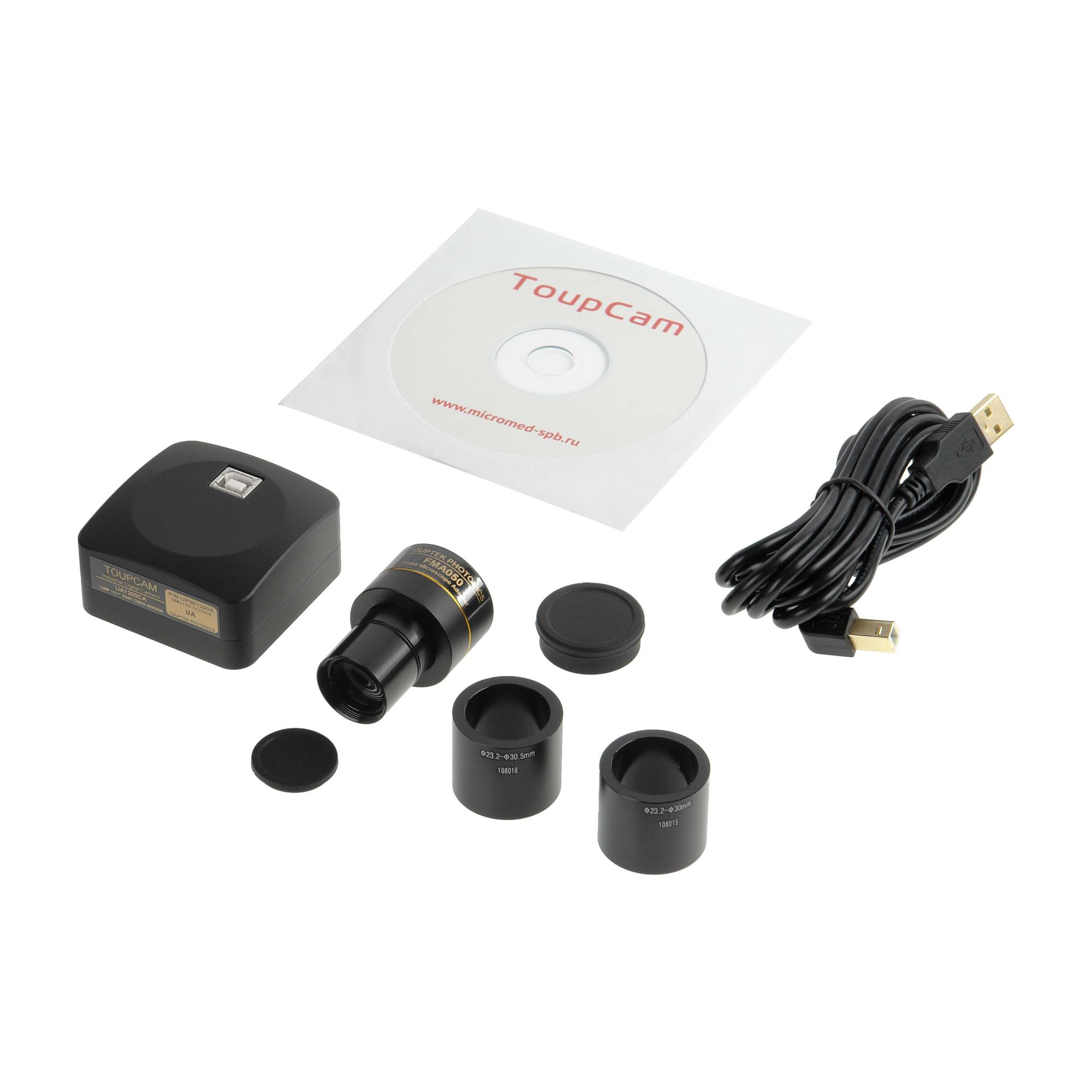 Благодаря комплектным адаптеру и переходникам, данную камеру можно использовать со всеми микроскопами Микромед. Съемный окулярный адаптер 0,5х имеет посадочный диаметр 23,2 мм. Крепление самой камеры стандартное - C-Mount, поэтому с ней будут совместимы любые другие адаптеры, имеющие крепление аналогичного стандарта, например адаптер для видеоокуляра ToupCam 0.37х и 0.75х. В комплект входят переходники для работы с микроскопами с посадочными диаметрами 30 мм и 30.5 мм.