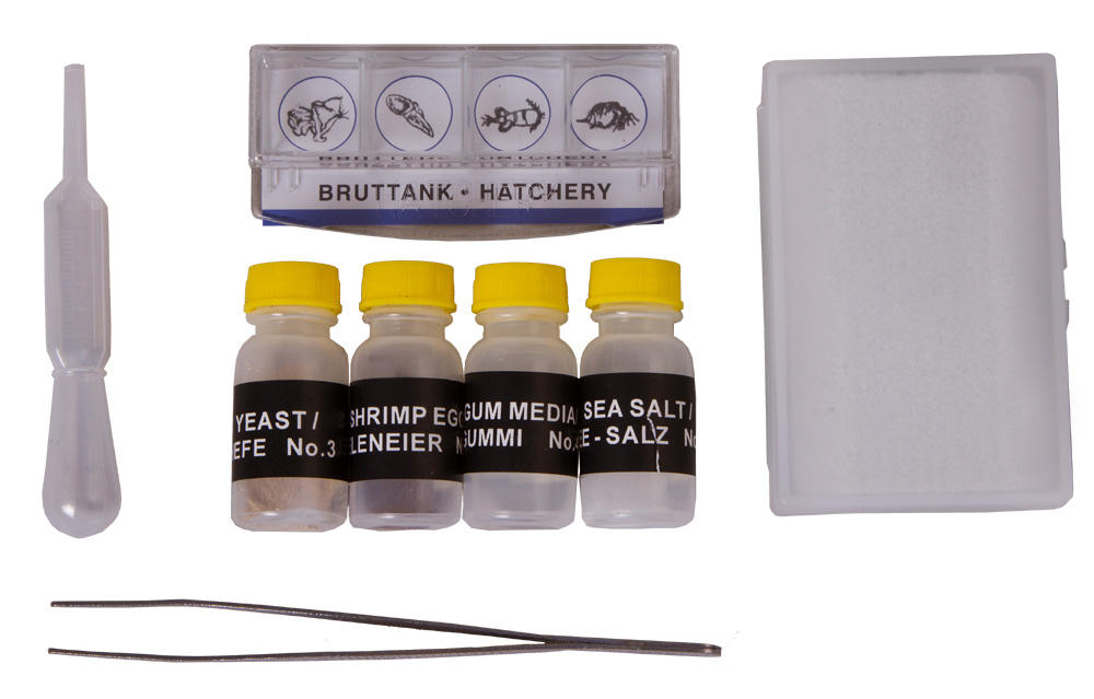 В комплект входит и набор для проведения опытов: готовые микропрепараты, покровные и предметные стекла, инкубатор для разведения артемии и инструменты для приготовления образцов.