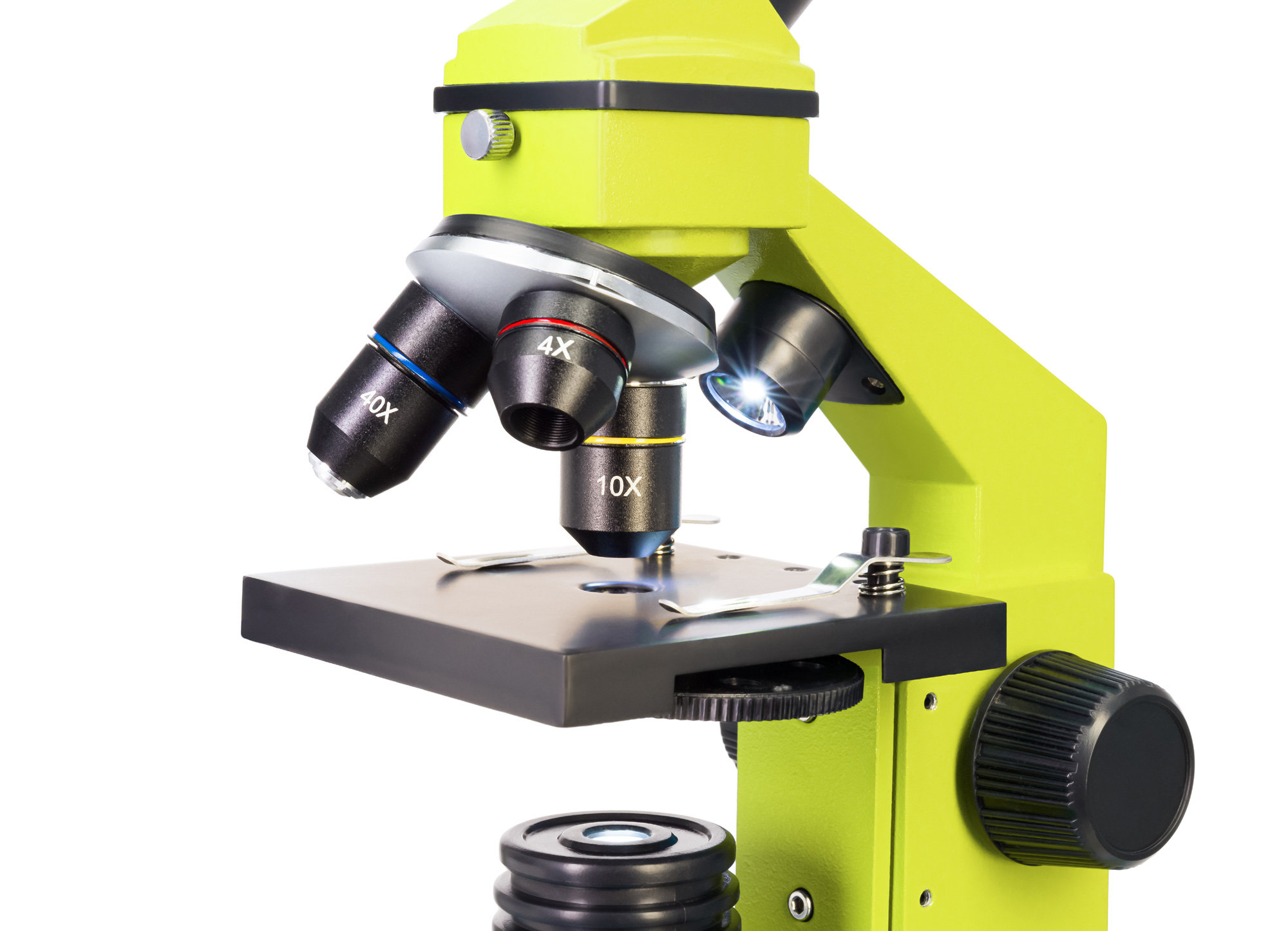 Три объектива позволяют получить широкий диапазон увеличений – от 64 до 640 крат. Для смены кратности нужно просто повернуть револьверное устройство. Объектив с наибольшим увеличением (40xs) снабжен пружинным механизмом, который надежно защищает оптику от повреждений. Если при фокусировке коснуться препарата объективом, он отодвинется и не сломается.