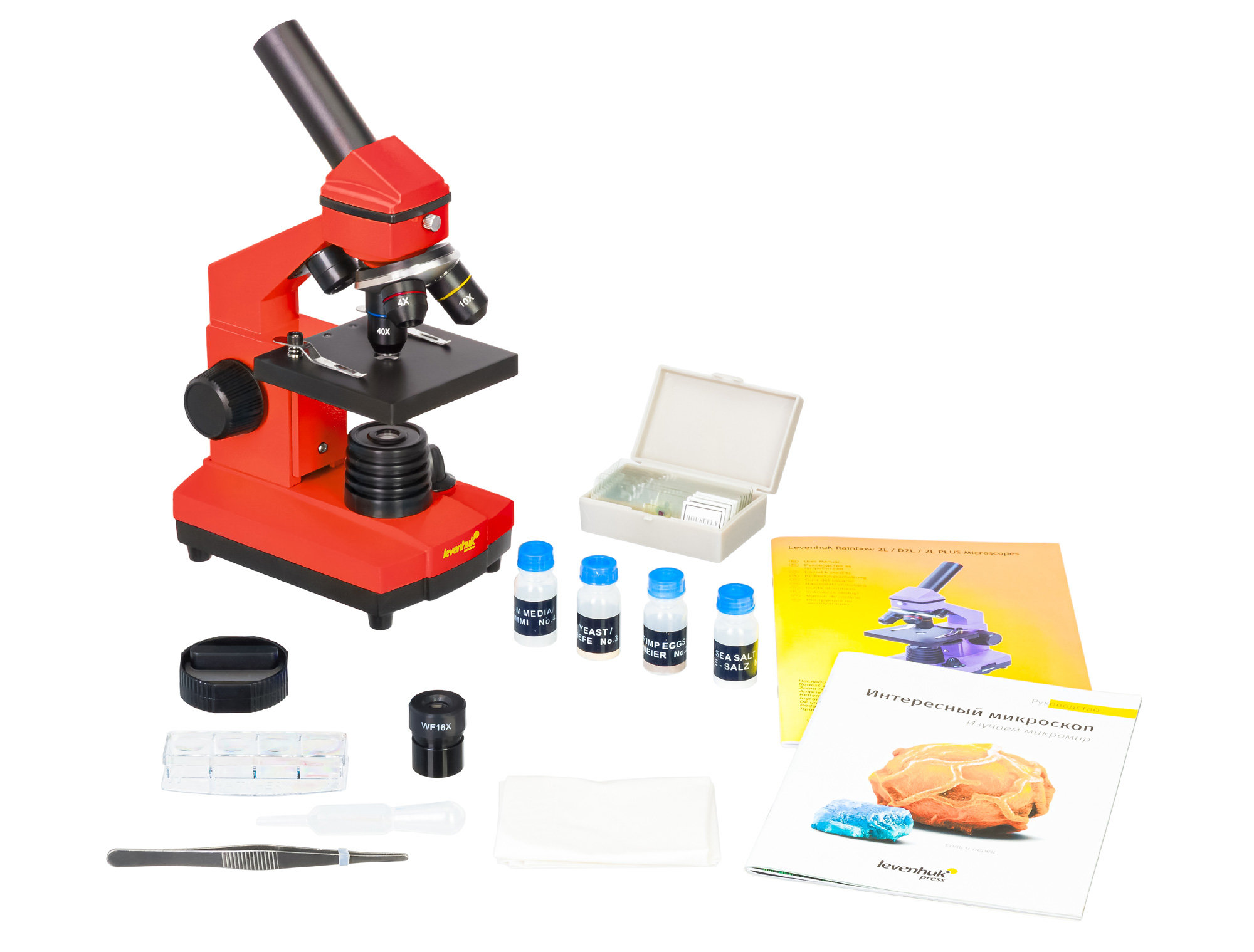 В комплекте есть все, что нужно для первого знакомства с микромиром. Набор Levenhuk K50 включает готовые препараты, инструменты для работы с микроскопическими объектами и подробное руководство с советами по работе с микроскопом и описаниями опытов.