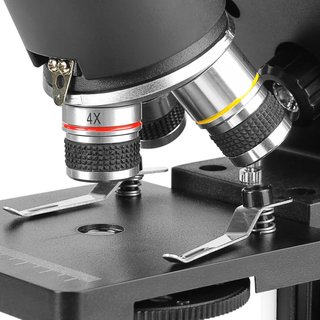 Объективы микроскопа имеют ахроматическую коррекцию, линзы изготовлены из оптических стекол. В комплекте три объектива 4x, 10x и объектив 40x с подпружиненным оптическим блоком, что препятствует повреждению оптики и изучаемого образца. Объективы обеспечивают яркое и резкое изображение с правильной цветопередачей не зависимо от того, как проводятся наблюдения – через окуляр или на мониторе. Объективы микроскопа установлены на револьверном устройстве, рассчитанном на 3 объектива, это позволяет наблюдателю быстро переходить к исследованиям с различными увеличениями.