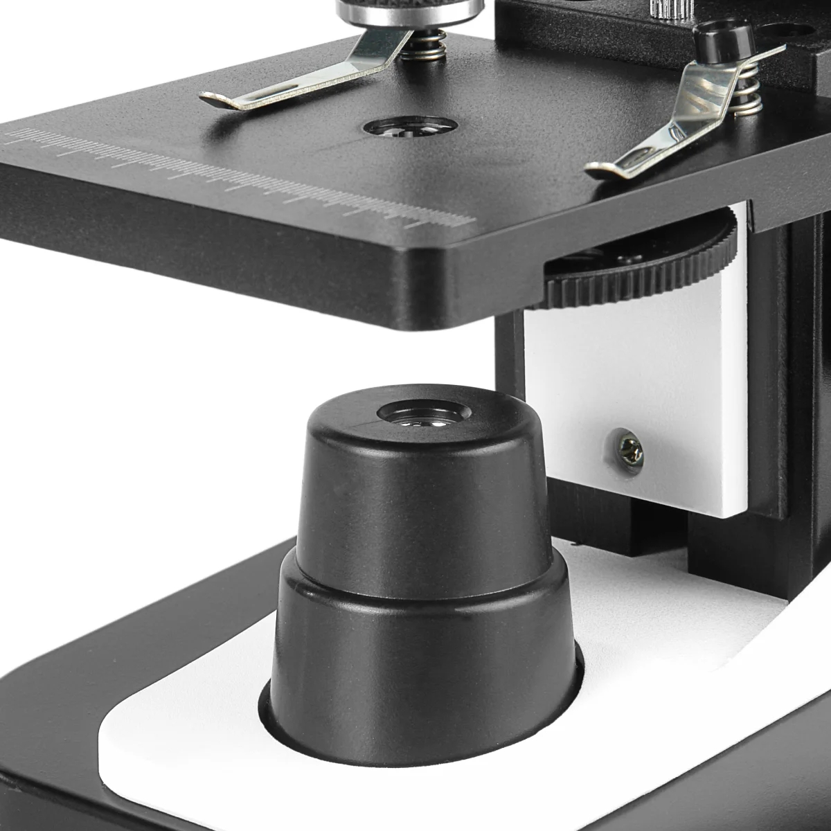 Для фокусировки микроскопа предназначен простой и надежный зубчато-реечный механизм, расположенный в штативе микроскопа. Механизм снабжен рукоятками фокусировки, выведенными на обе стороны штатива. Фокусировка осуществляется перемещением предметного столика по вертикали. Предметный столик микроскопа имеет размер 90 х 90 мм и оснащен пружинными зажимами для фиксации исследуемого препарата и измерительной линейкой для контроля перемещения.