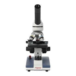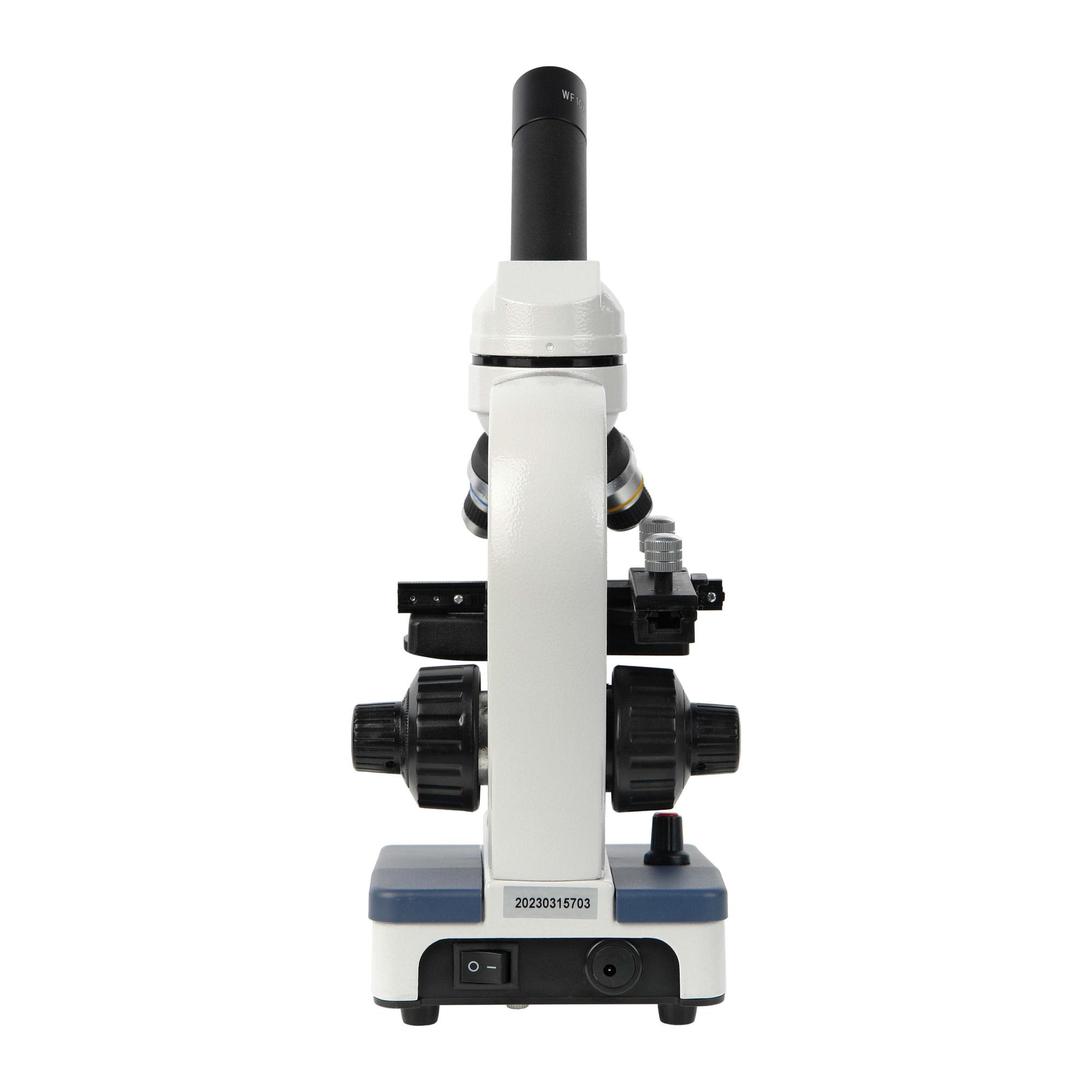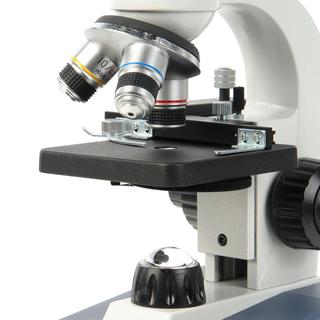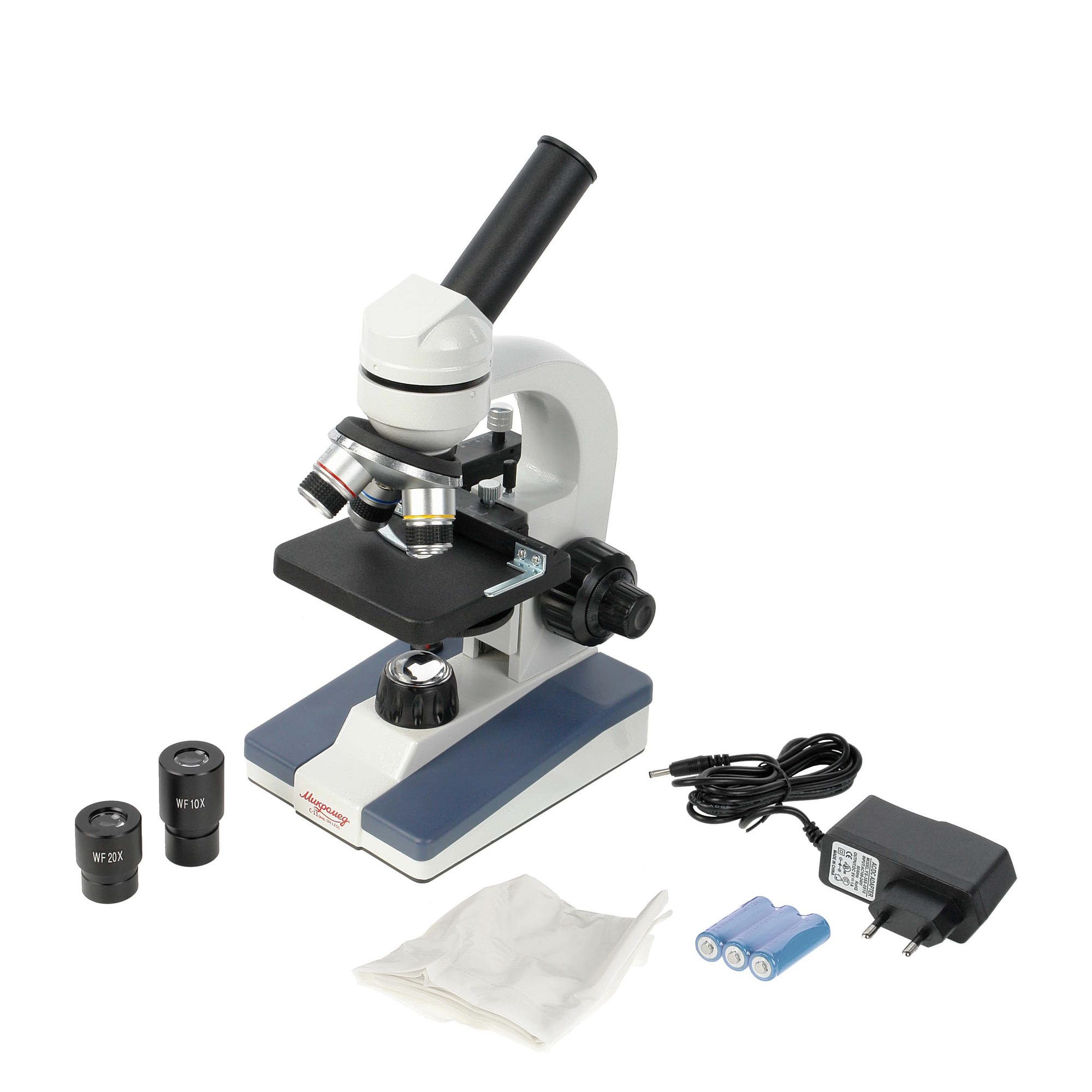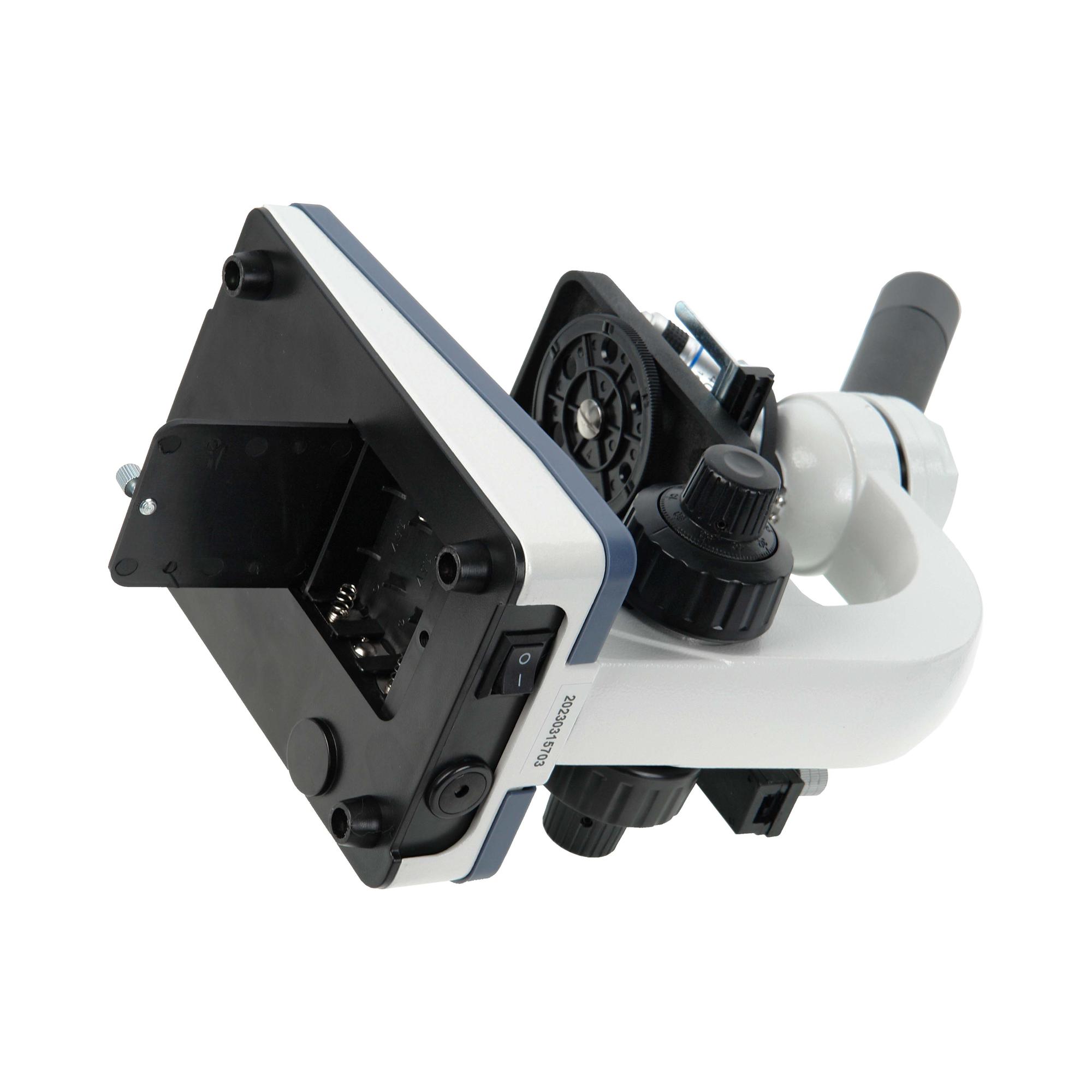 Осветитель снабжен коллекторной линзой, что повышает равномерность и яркость освещения предмета исследования и имеет бесступенчатую регулировку яркости. Питание микроскопа производится от 3-х щелочных батареек тип АА или от входящего в комплект сетевого адаптера. Возможность питания микроскопа от батарей позволяет пользоваться микроскопом не только в учебном классе или дома, но и в любых ситуациях, когда электросеть недоступна.