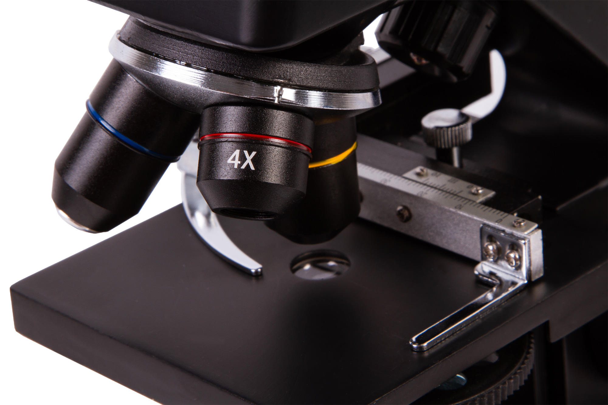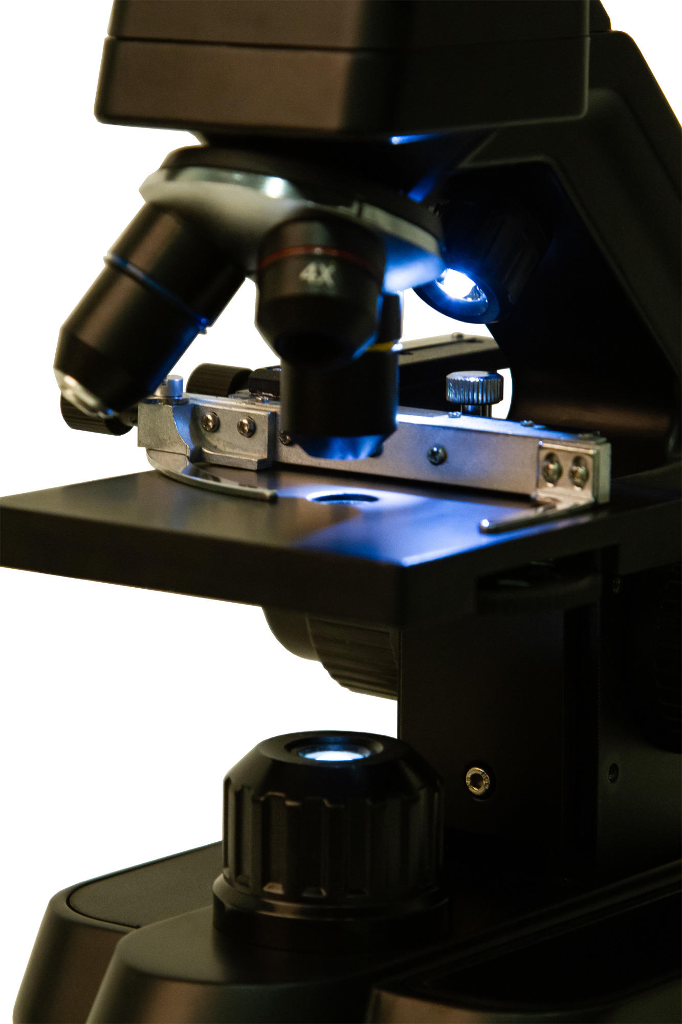 Оптическая часть микроскопа представлена тремя объективами разной кратности. Осветительная система – светодиоды по обеим сторонам предметного столика. Такое расположение подсветки позволяет изучать образцы любой степени прозрачности: бактерии, растительные и животные ткани, насекомых, крошечные организмы в капле воды и многое другое. Дополнительно в оптический путь включен диск с диафрагмами и светофильтрами. Чтобы настроить резкость, можно использовать грубую или точную фокусировку.