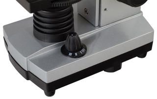 Микроскоп снабжен двумя светодиодными осветителями регулируемой яркости, которые могут быть включены как одновременно, так и по отдельности. Благодаря возможности регулировать яркость осветителей можно подобрать оптимальную освещенность для каждого микропрепарата. Питание осветителей может производиться как от батареек, так и от электросети переменного тока (адаптер в комплекте).