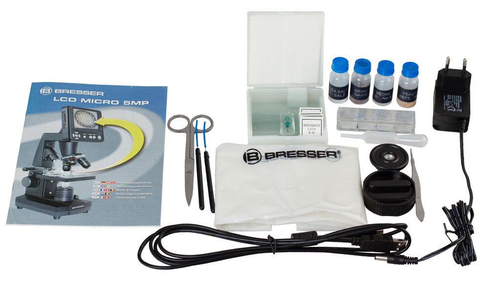 Микроскоп Bresser LCD 50x-2000x имеет богатую комплектацию, что делает его незаменимым для начинающих биологов. В комплект входят не только необходимые для работы аксессуары, но и набор готовых микропрепаратов.