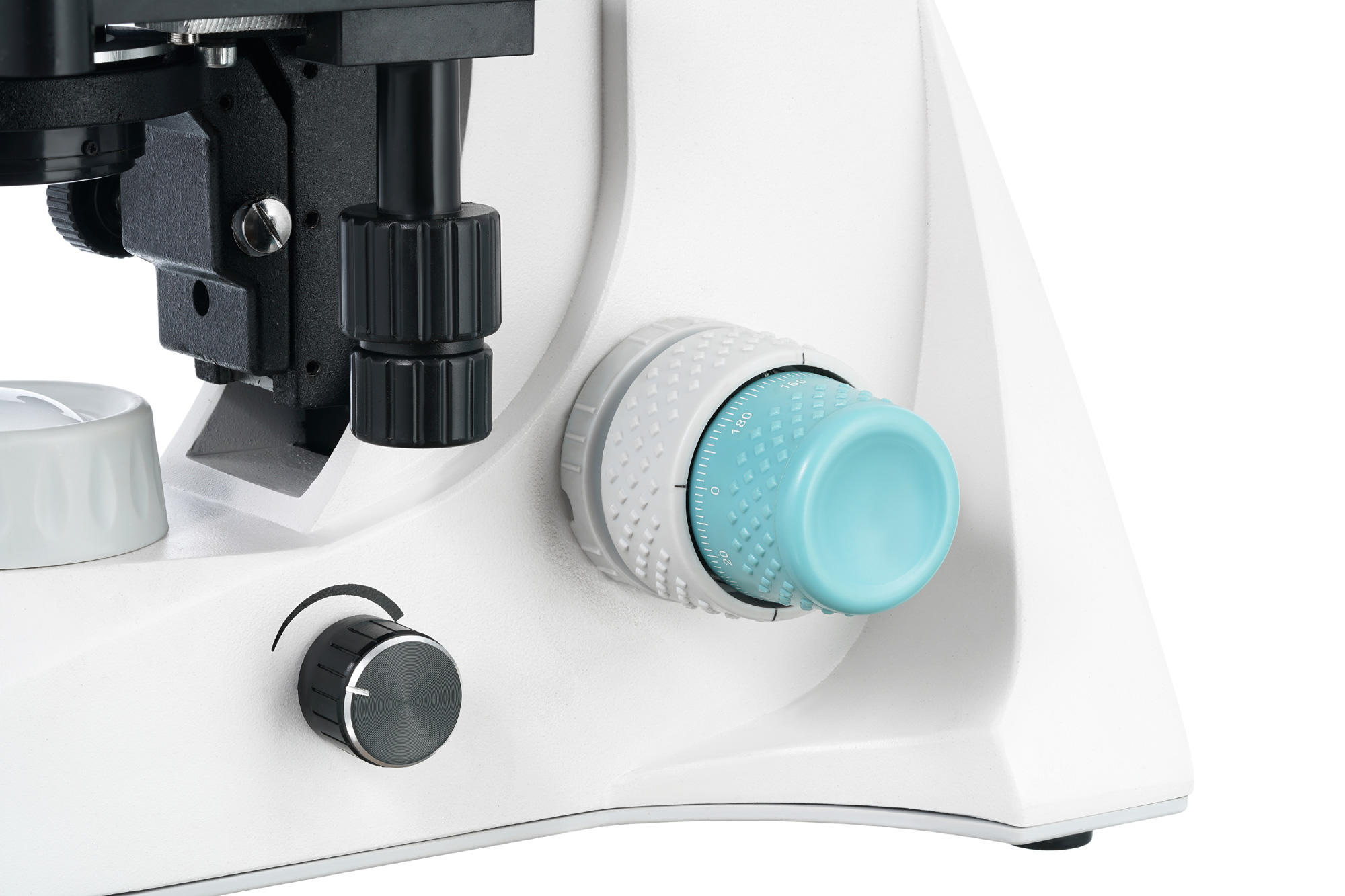Образцы для исследований размещаются на предметном столике с препаратоводителем. Система освещения находится внизу и представляет собой 3-ваттный светодиод с коллектором, яркость которого можно регулировать. Интенсивность освещения также можно настраивать при помощи конденсора Аббе с ирисовой диафрагмой и держателем фильтра. Для питания подсветки необходимо подключение к сети переменного тока.