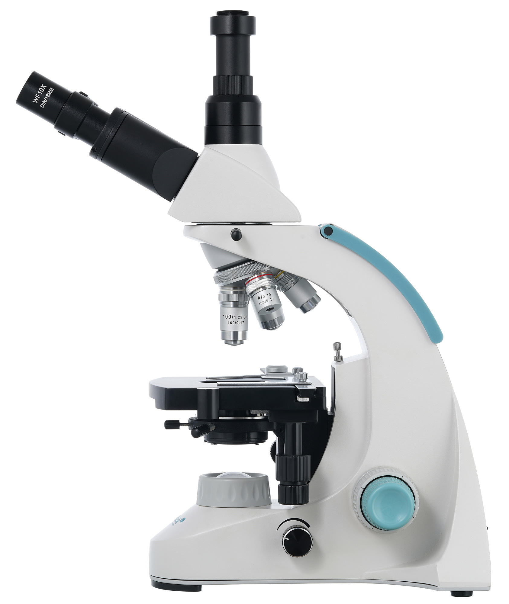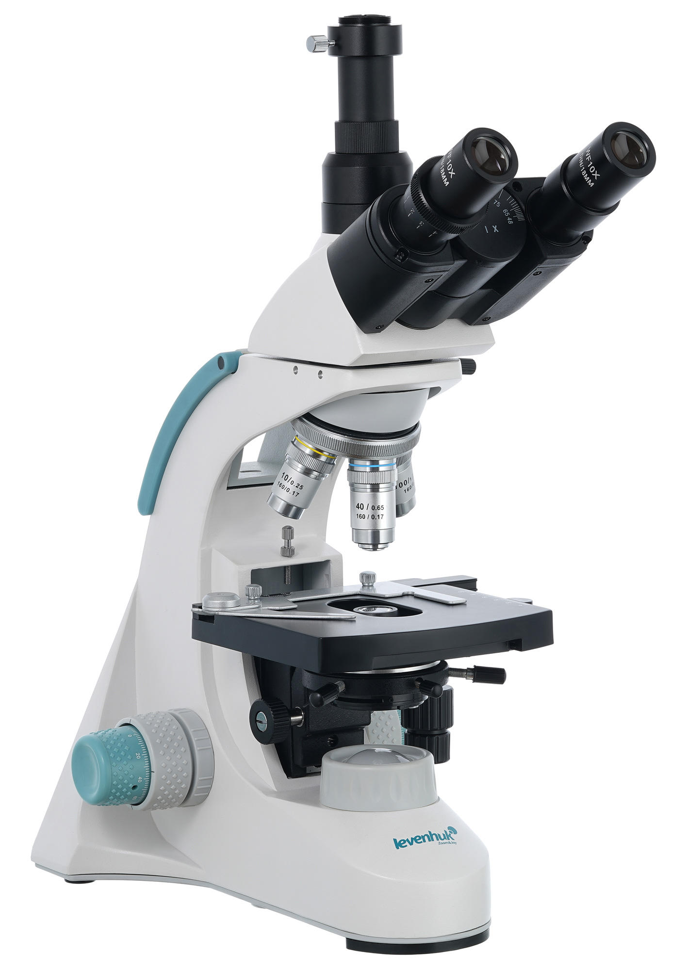 Оптическая схема включает широкопольные 10-кратные окуляры и ахроматические объективы разной кратности. Объективы 40х и 100х имеют защиту передней линзы – пружинящую оправу. При наблюдениях можно использовать «сухой» метод (все объективы) или масляную иммерсию (только 100-кртаный объектив). Тринокулярную насадку можно вращать на 360°, наклон визуального блока составляет 30°, а отдельная вертикальная трубка используется для установки цифровой камеры (в комплекте).