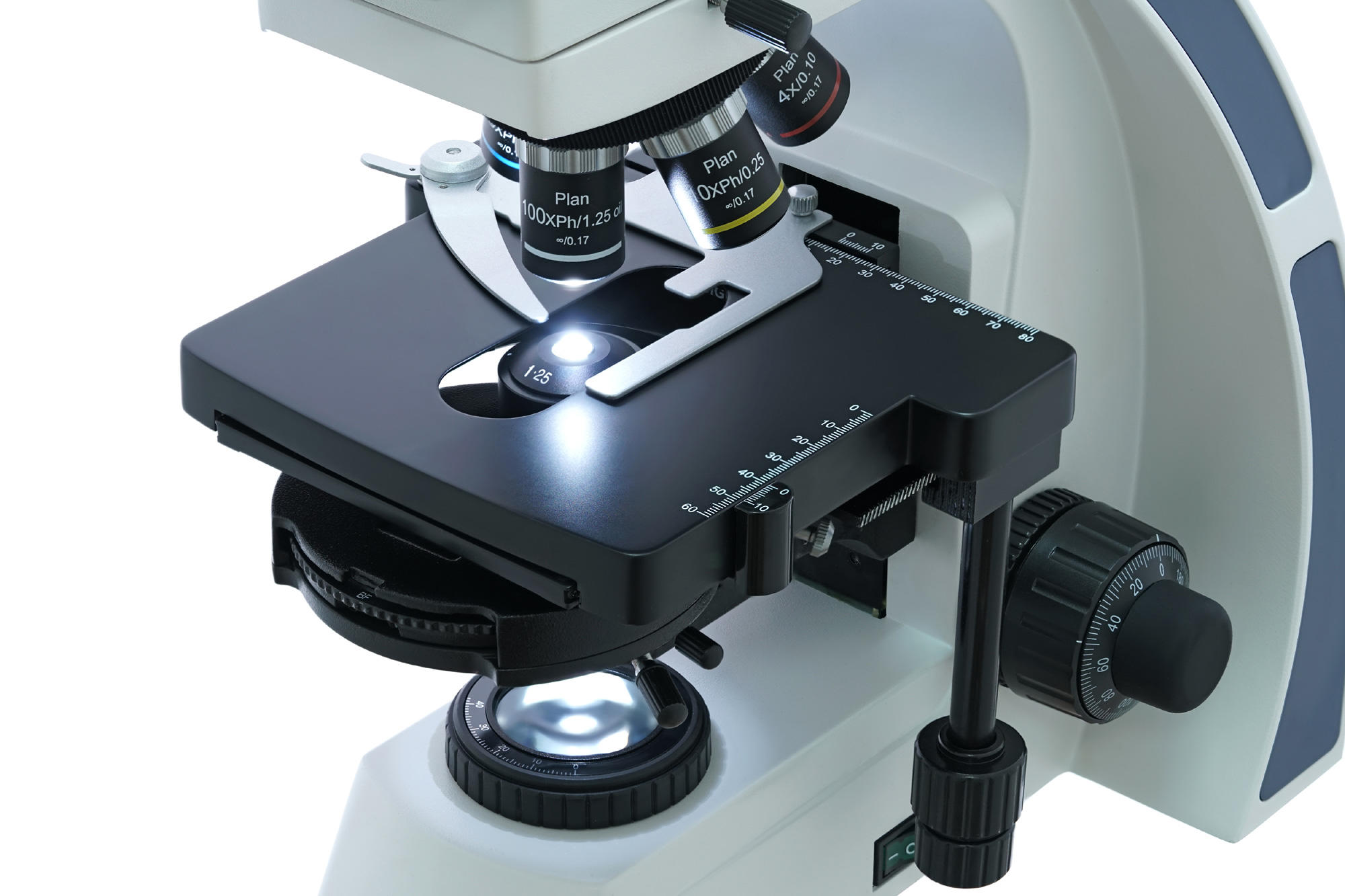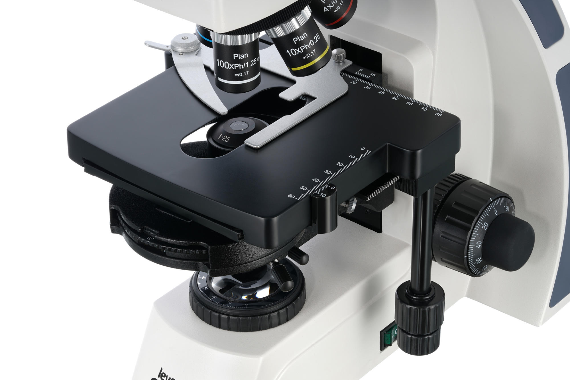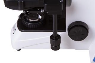 Для установки микропрепаратов на предметном столике используется препаратоводитель. Рядом находятся ручки грубой и точной фокусировки. Источник освещения – нижний светодиод с регулировкой яркости. Есть «сухой» фазовый конденсор с темным полем. Доступна настройка освещения по Келеру.