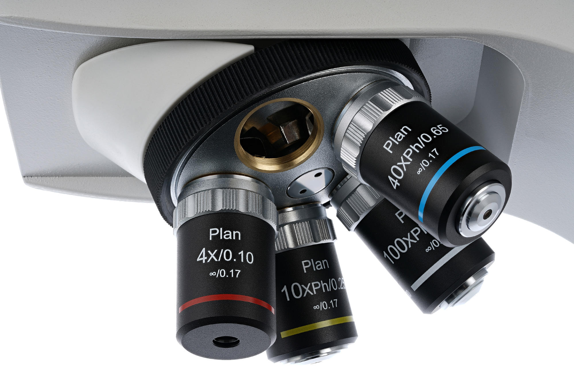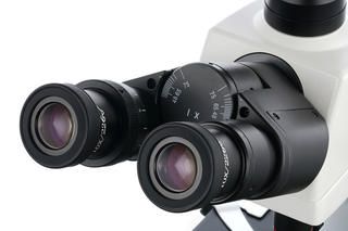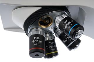Планахроматическая оптика убирает из картинки хроматизм и другие искажения. В комплект поставки включены четыре фазовых объектива разной кратности и широкопольные окуляры с диоптрийной коррекцией. Изображение получается четким и плоским – идеальным для профессиональных исследований. Два объектива с наибольшим увеличением имеют пружинящие оправы для защиты оптики от случайных повреждений. Для масляной иммерсии используется 100-кратный объектив. Окуляры устанавливаются в бинокулярный визуальный узел. Отдельная окулярная трубка служит для установки цифровой камеры (в комплекте). Вся тринокулярная насадка вращается на 360°.