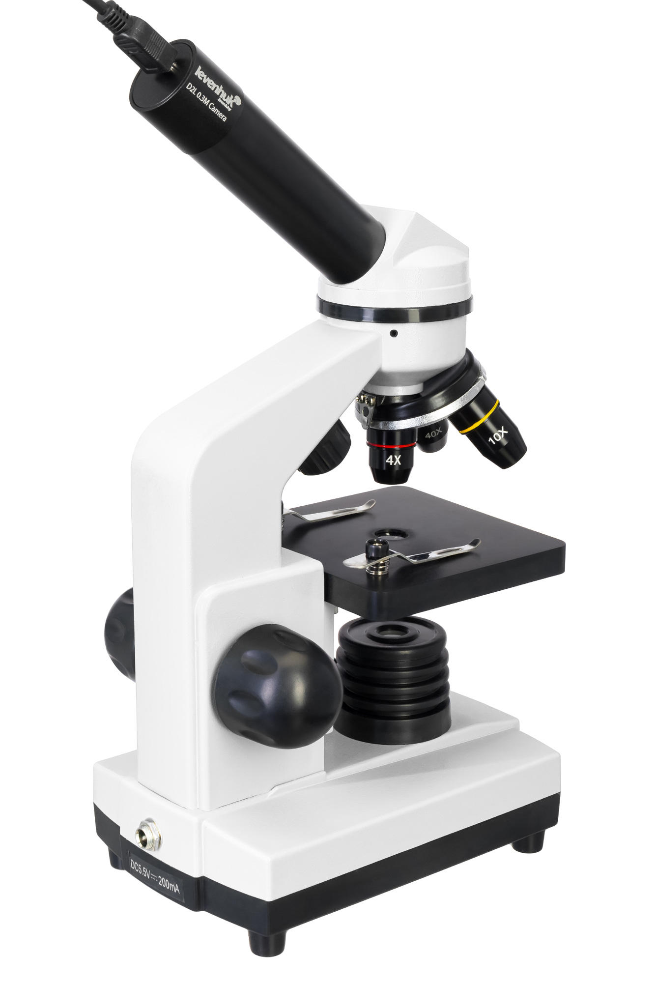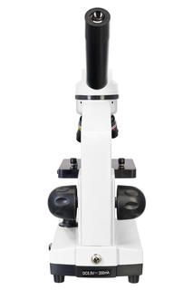Микроскоп выпускается в корпусе из прочного пластика – при небольшом весе он получился очень надежным. Для удобства пользователя монокулярная насадка наклонена на 45°. Прибор работает и от сети переменного тока, и от стандартных батареек. Питание камеры осуществляется от компьютера через USB-кабель.