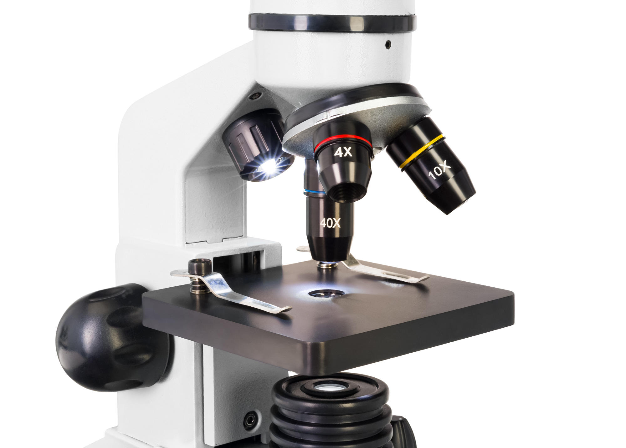 Оптические элементы изготовлены из специального стекла – оно отличается высокой прозрачностью и не искажает картинку. Многослойное просветление повышает яркость и резкость изображения – это особенно важно при изучении препаратов на высоких увеличениях. Микроскоп снабжен тремя объективами, с которыми дает увеличения 40, 100 и 400 крат. Для смены кратности поверните револьверное устройство.