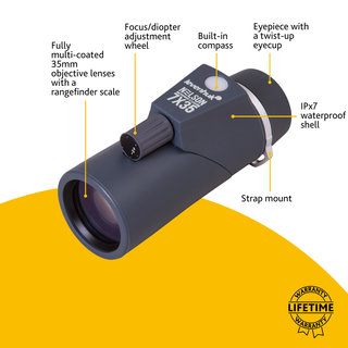 Увеличение монокуляра составляет 7 крат, минимальное расстояние фокусировки – всего 3 м. Универсальный оптический прибор подойдет для изучения и близких, и удаленных объектов. Материал оптики – высококачественное стекло марки BaK-4. На линзы нанесено полное многослойное просветляющее покрытие, благодаря этому картинка получается яркой и детализированной. Дуговая шкала встроенного компаса видна в окуляре, цена деления – 1°. Компас показывает направление на объект, выраженное в градусах. Север находится на отметке 360°, юг – 180°, восток – 90° и запад – 270°. Подсветки у компаса нет, поэтому мы рекомендуем применять его в светлое время суток.