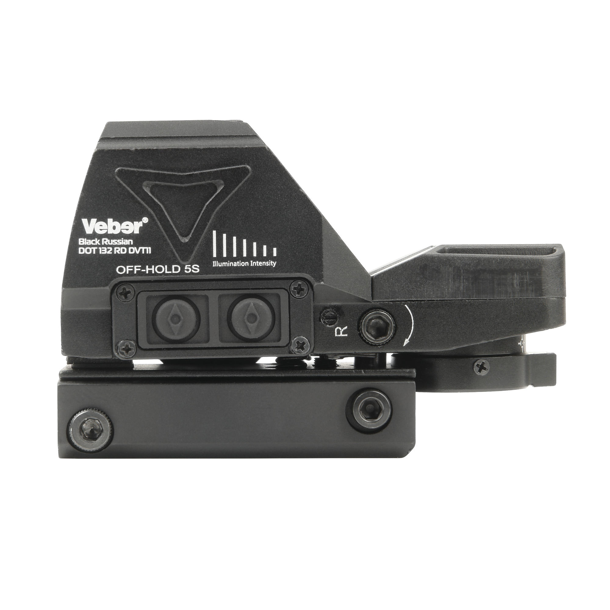 Корпус соединен с креплением для установки на планку «ласточкин хвост» 11 мм длиной от 22мм. Также выпускается модификация прицела Veber Black Russian DOT 132 RD Weaver для установки на оружие с планкой Weaver.