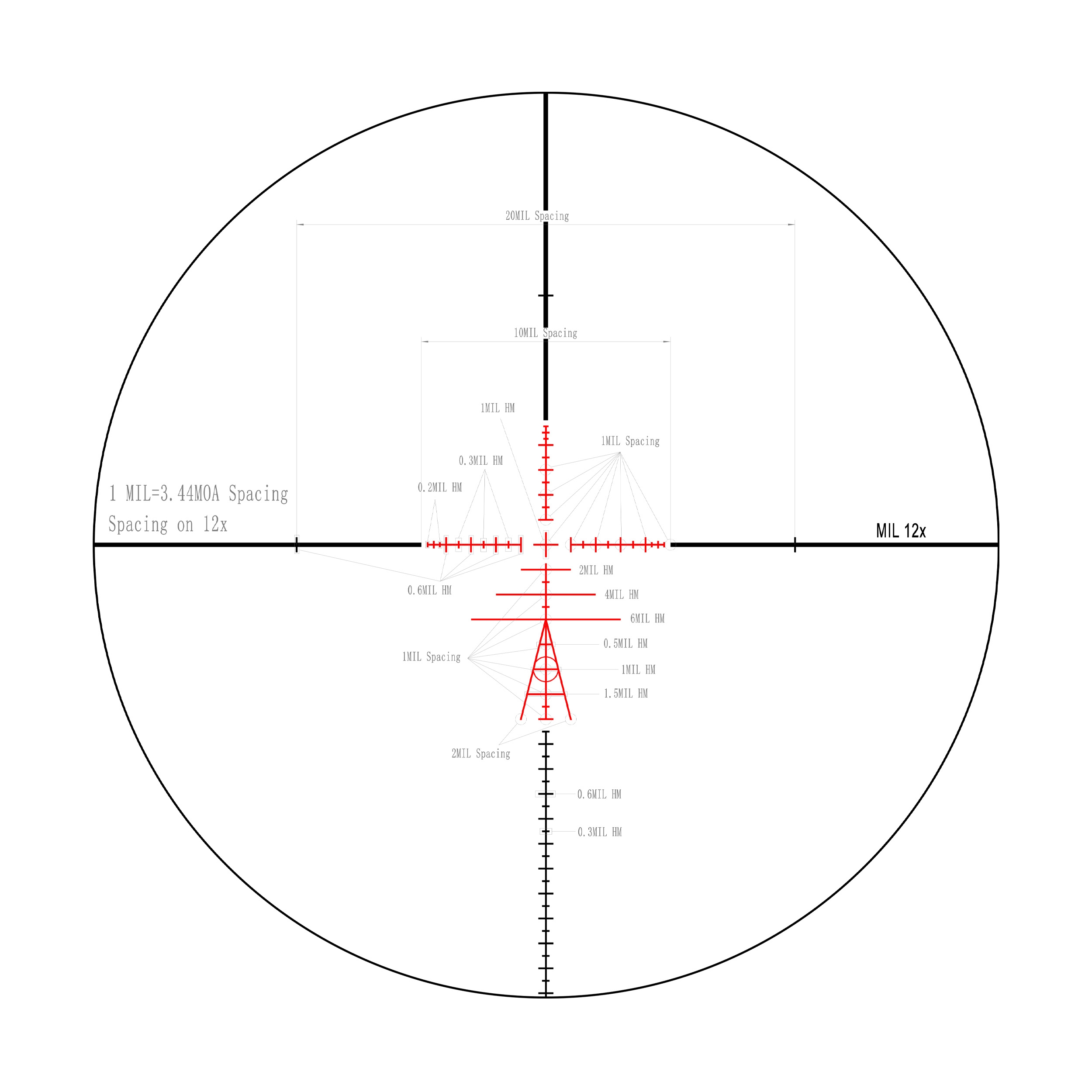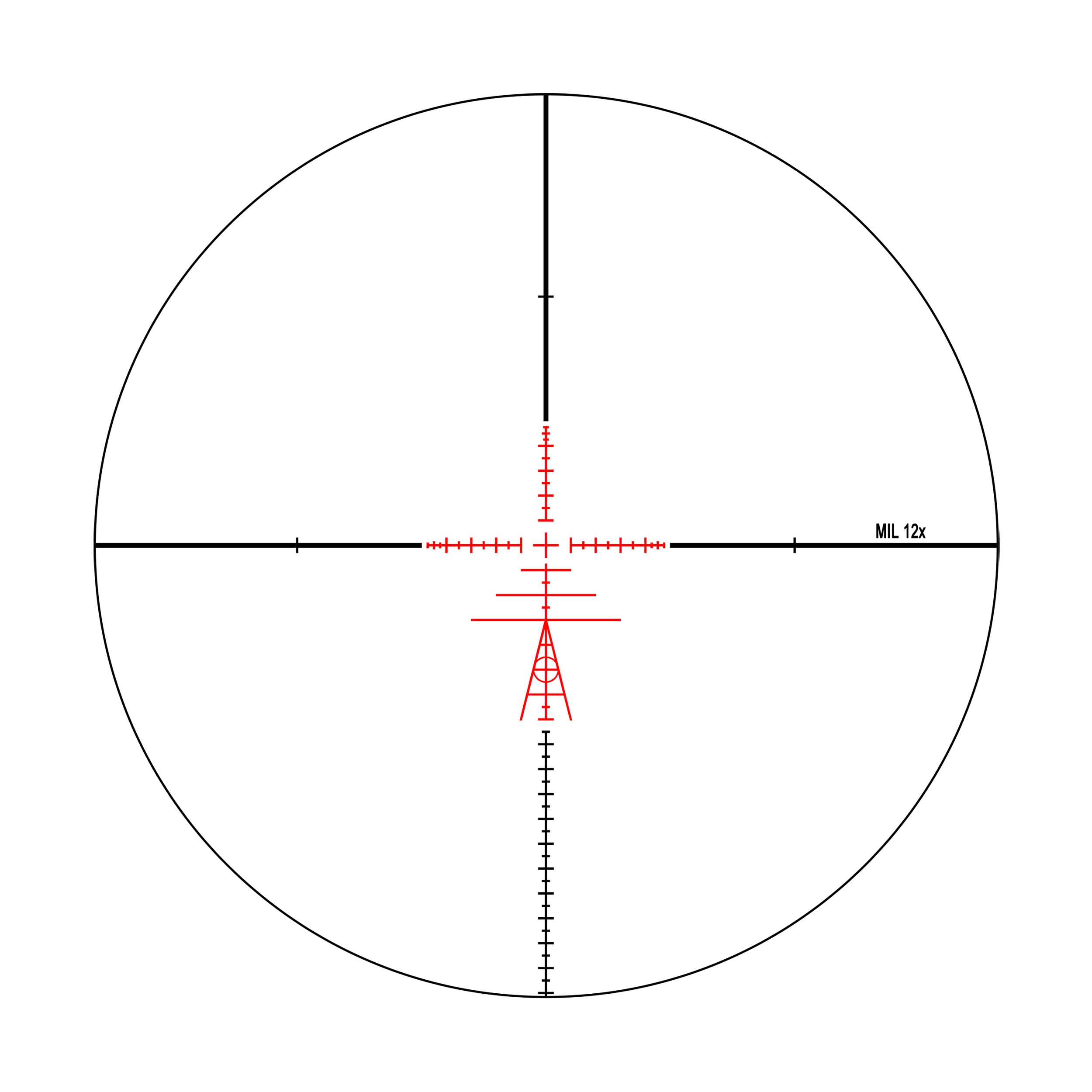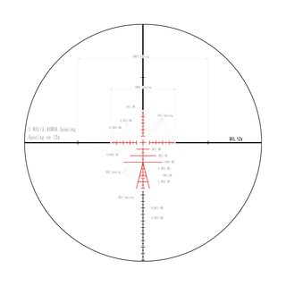 Вытравленная на стекле тактическая прицельная сетка TR2 расположена во второй фокальной плоскости прицела (SFP). Видимый размер сетки и перекрестия в поле зрения не изменяется при изменении кратности прицела. Вследствие этого измерение размеров на цели и определение поправок с помощью прицельной сетки верно при максимальной кратности прицела 12х.