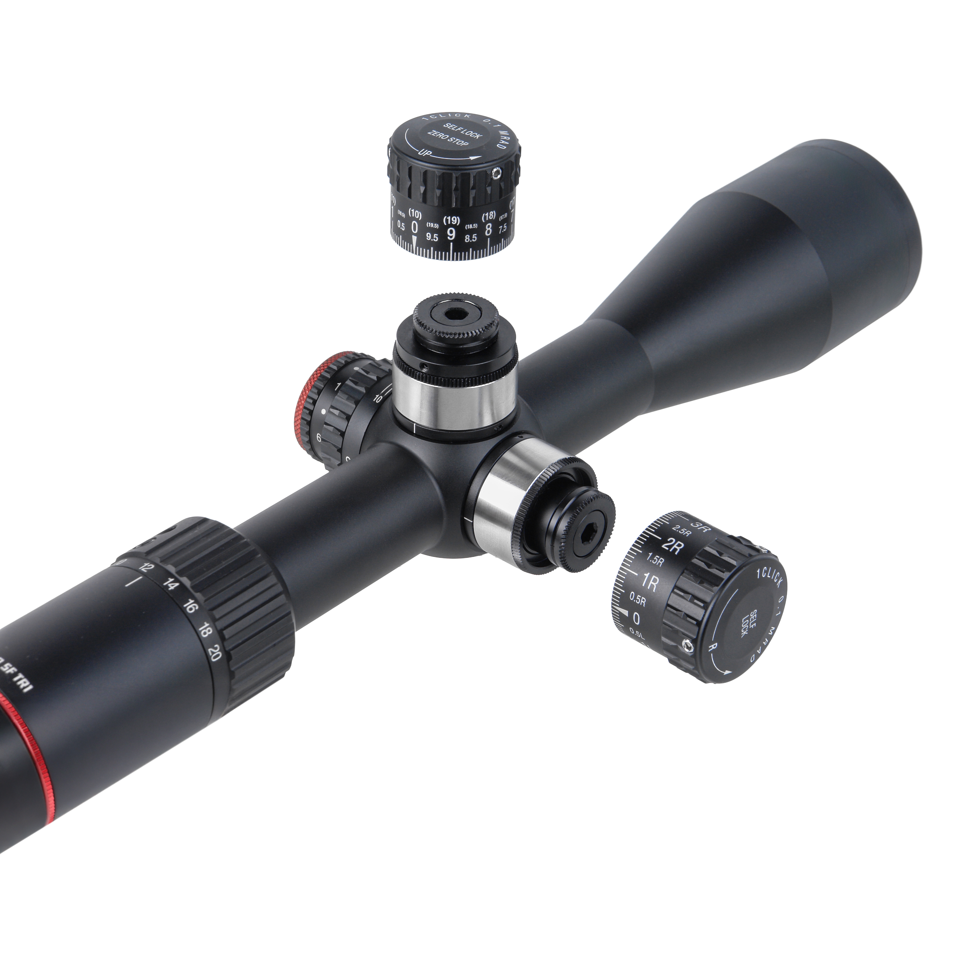 Шкалы механизма ввода поправок отградуированы в MRAD, цена деления 1 клика - 0,1 MRAD. Соответственно поворот шкалы на 1 клик перемещает на 1 см прицельную марку на мишени, удаленной на 100 м.