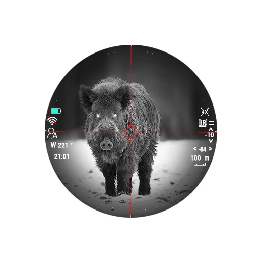 Баллистический калькулятор оперативно рассчитывает траекторию на основе ручного ввода дистанции до цели. Система учитывает баллистические параметры патрона (скорость, вес пули, баллистический коэффициент) и внешние условия, автоматически вычисляя точку прицеливания. Встроенный гироскоп корректирует расчеты при стрельбе под углом. Для разных сценариев стрельбы доступно создание до 5 профилей для различных винтовок и типов боеприпасов.