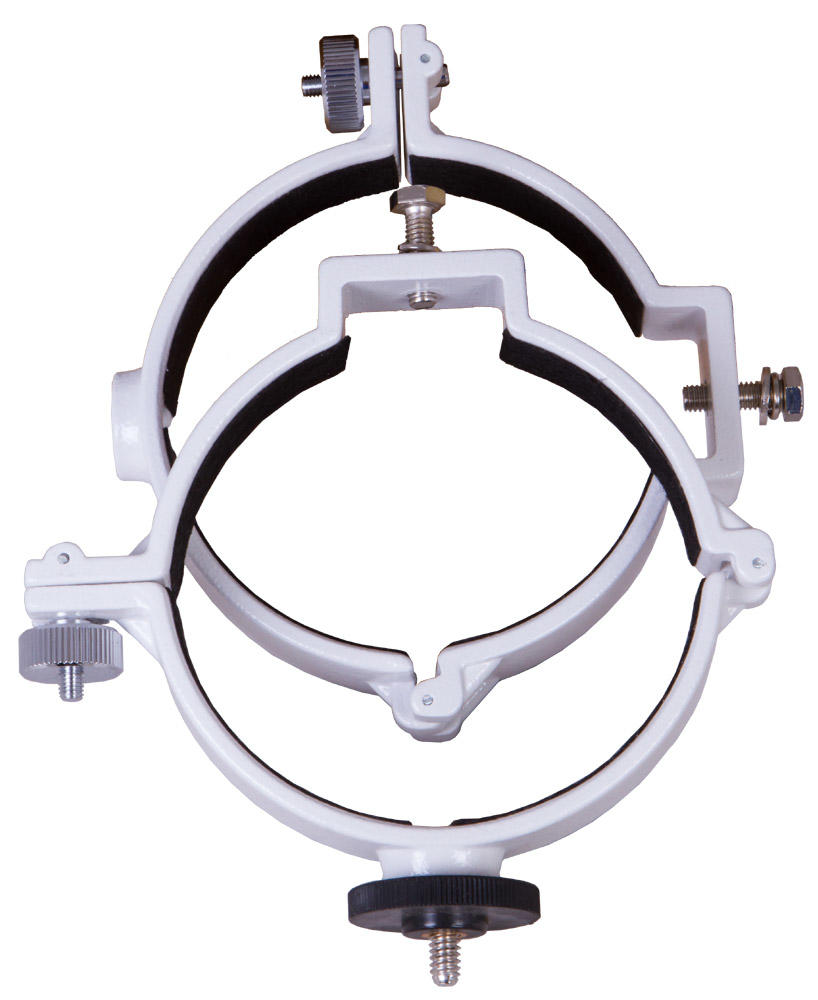Эти крепежные кольца Sky-Watcher предназначены для фиксирования рефрактора с апертурой 101–102 мм на монтировке с винтовым креплением 1/4” или с креплением «ласточкин хвост». Силу фиксации можно регулировать – для этого используются боковые винты. Всего в набор входят два кольца, на одном из которых есть дополнительное крепление, используемое для фиксирования фотооборудования.