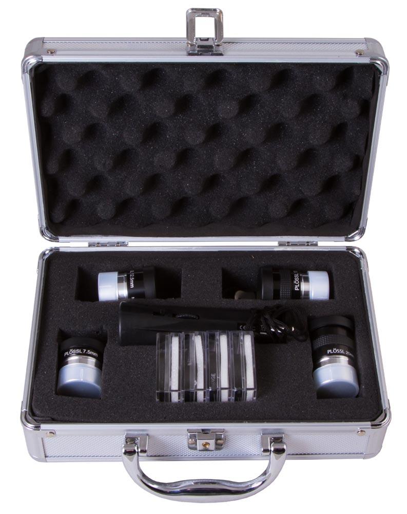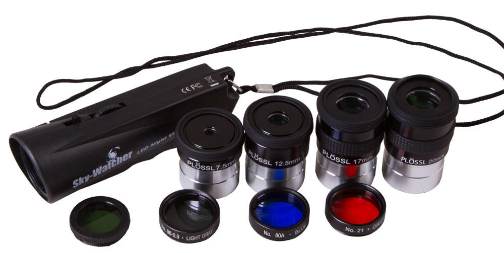 Набор аксессуаров Sky-Watcher Super Plössl состоит из четырехлинзовых окуляров Super Plössl, светофильтров, светодиодного фонарика и кейса для транспортировки и хранения. Комплект ориентирован на опытных и требовательных любителей астрономии и станет хорошим выбором для подробных лунных и планетарных наблюдений. Посадочный диаметр всех оптических аксессуаров составляет 1,25", поэтому они совместимы с большинством современных телескопов любых оптических схем и марок.