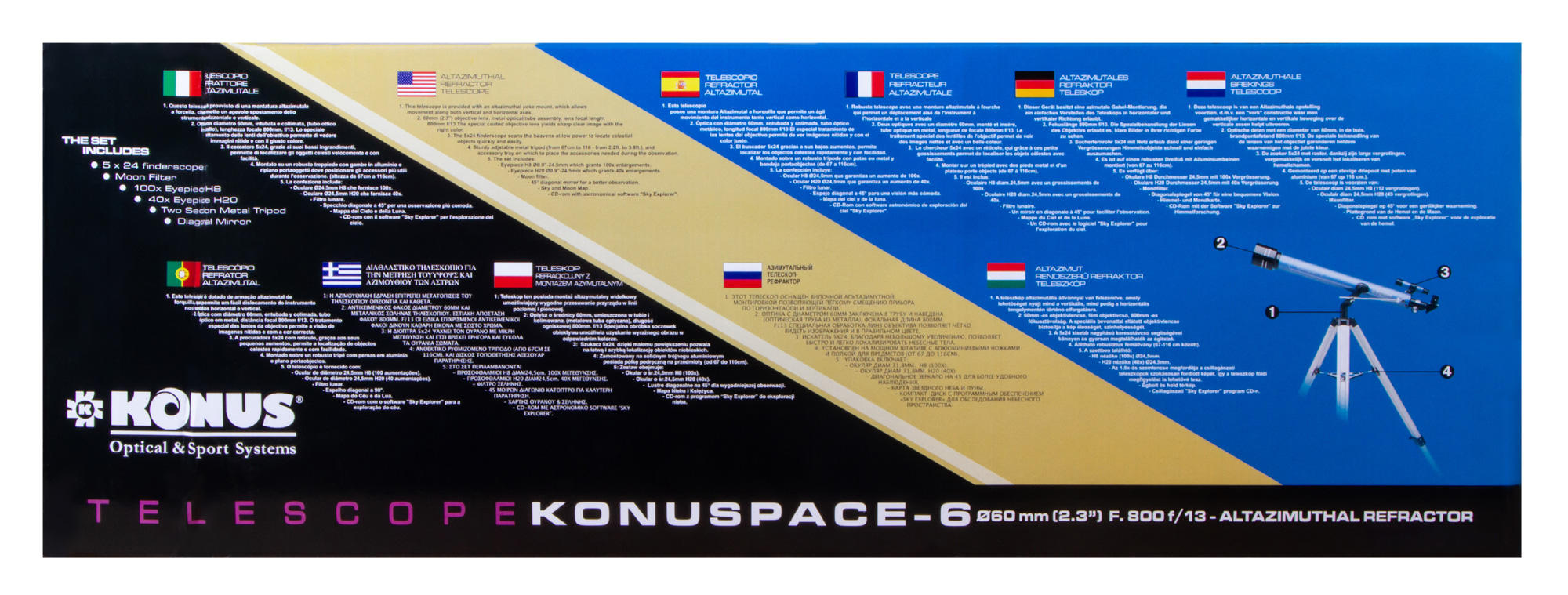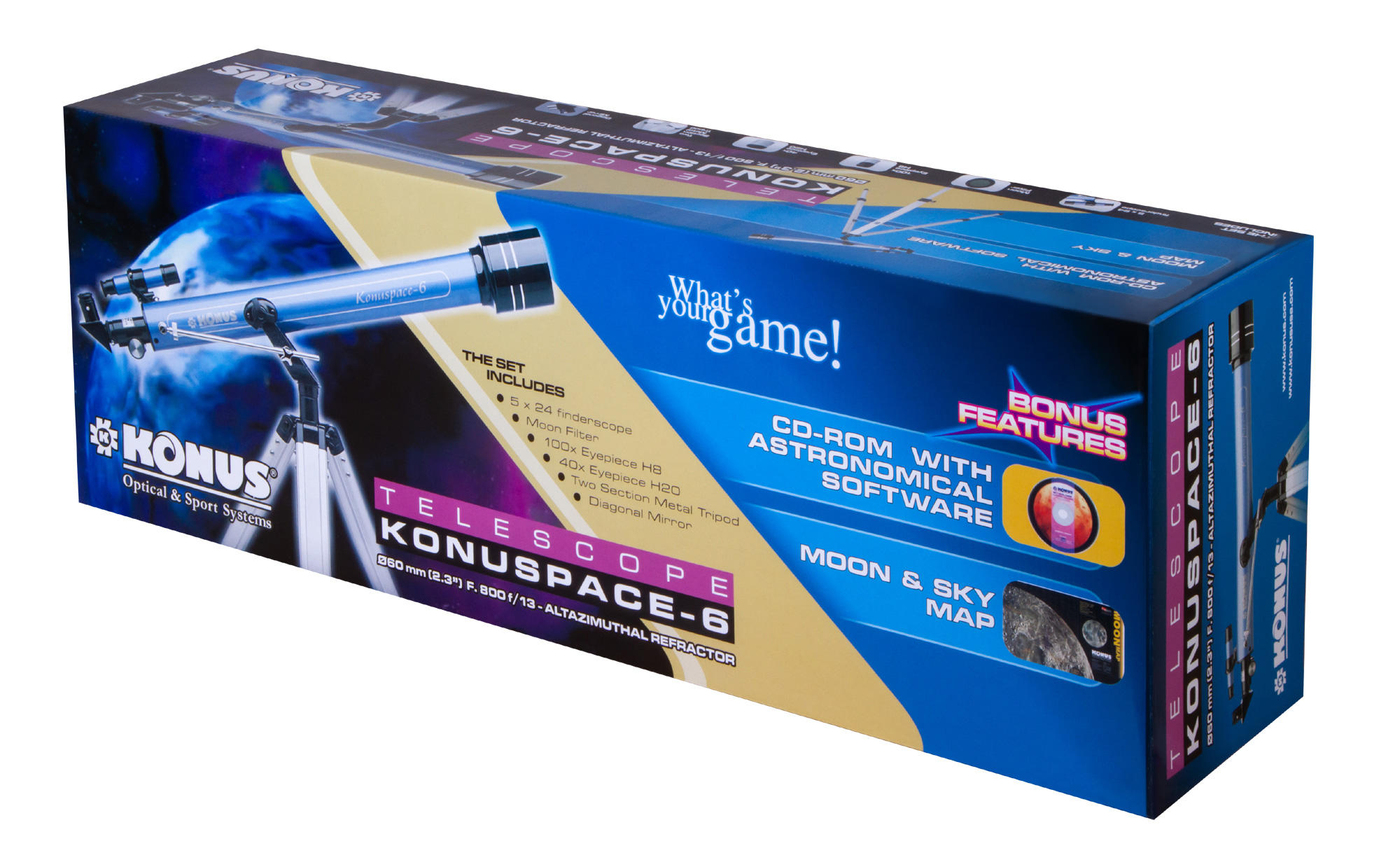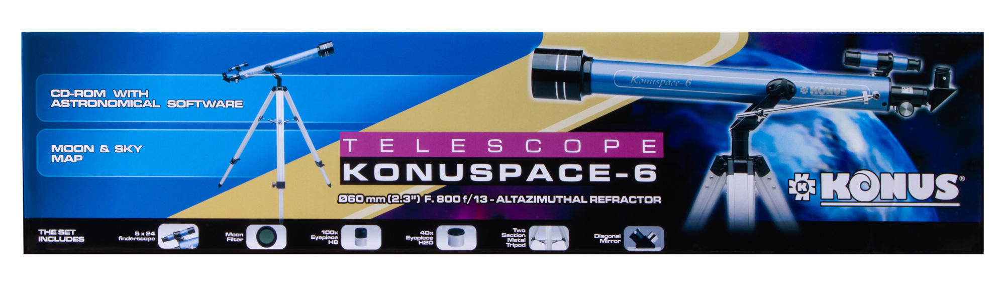 Телескоп Konus Konuspace-6 60/800 AZ создан для начальных астрономических наблюдений и станет прекрасным подарком ребенку или астроному-любителю, который еще только начинает свой путь в науку. Этот ахроматический рефрактор позволит получить общие представления об изучении космоса, детально рассмотреть Луну и увидеть отдельные планеты, но без деталей на них. Konus Konuspace-6 60/800 AZ также можно использовать и как зрительную трубу для наземных наблюдений.