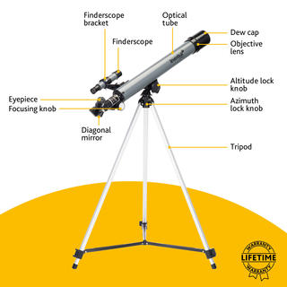 Телескоп собран по схеме ахроматического рефрактора из стеклянных линз с антибликовым покрытием. Световой диаметр составляет 50 мм, поэтому для астрономических наблюдений желательно выбирать яркие объекты ночного неба, например Луну. По наземным объектам прибор передает достойную по качеству картинку даже при слабой освещенности.