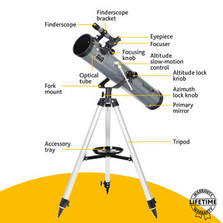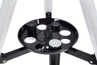Монтировка азимутальная, поэтому управлять телескопом очень просто – как обычной зрительной трубой. На вертикальной оси есть микровинт, с помощью которого можно производить более точную наводку на объекты. Тренога сделана из алюминия, дополнена полочкой для аксессуаров. При необходимости высоту треноги можно регулировать.