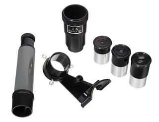 В оптической схеме используются линзы и зеркала. Оптика сделана из стекла и дополнена антибликовым покрытием. Передаваемая телескопом картинка четкая и контрастная, свободная от искажений. Удобно, что в комплектацию включено три окуляра и линза Барлоу – благодаря им при наблюдениях можно использовать множество разных увеличений.