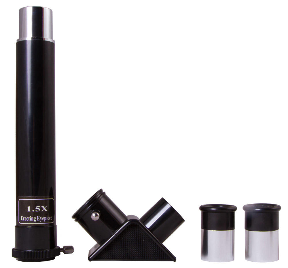 В комплекте с телескопом идут два окуляра разной кратности. Оборачивающий окуляр позволяет видеть все наблюдаемые объекты неперевернутыми, поэтому телескоп можно использовать как зрительную трубу.