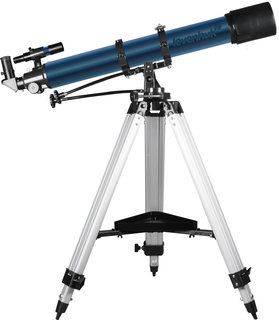 Диаметр объектива-ахромата составляет 90 мм, а все оптические элементы выполнены из стекла высокого качества с полным многослойным просветлением, поэтому телескоп передает яркое, контрастное и четкое изображение с минимумом искажений. При благоприятном состоянии атмосферы через телескоп можно увидеть очень тусклые объекты. В комплект уже включены окуляры 10 и 25 мм: первый дает на телескопе увеличение 90х и хорошо подходит для детального изучения планет, второй – это обзорный окуляр (увеличение 36х). Для удобства поиска объектов используется оптический искатель 6х30, а оборачивающая призма обеспечивает правильное прямое изображение, необходимое при изучении наземных ландшафтов.