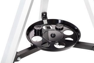Азимутальная монтировка позволяет максимально просто и удобно управлять телескопом. Благодаря микровинту на вертикальной оси перемещение оптической трубы происходит плавно и точно. Тренога сделана из алюминия, дополнена лотком для аксессуаров. Благодаря регулировке высоты ее легко можно адаптировать под пользователей разного роста.