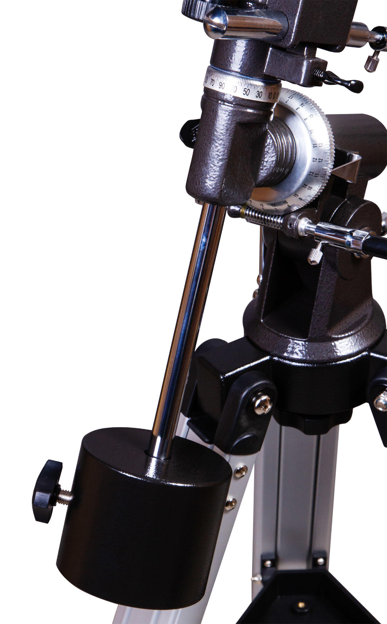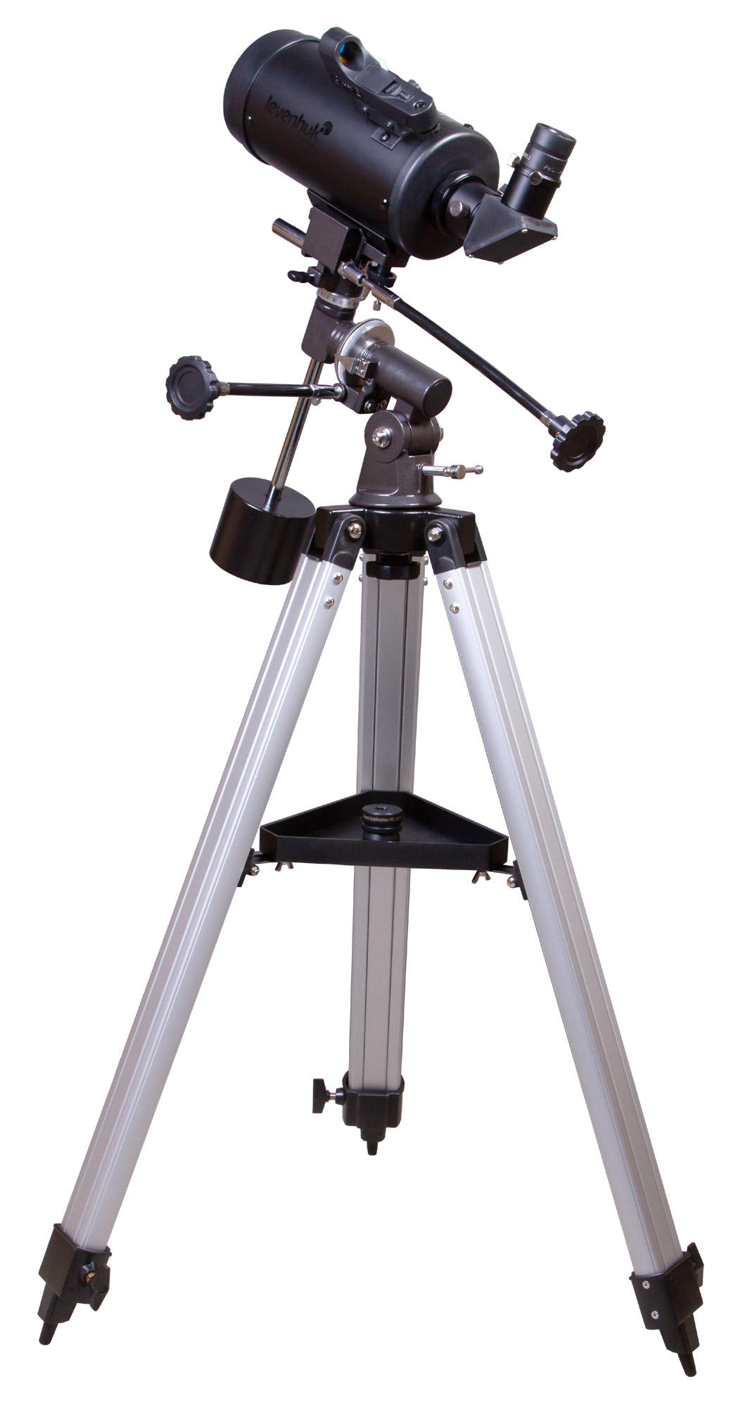 Экваториальная монтировка управляется при помощи ручек тонких движений. Следить за движением небесных тел удобно и легко. Монтировка крепится к алюминиевой треноге. На нее устанавливается лоток для аксессуаров. Высоту ножек треноги можно регулировать.