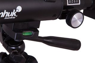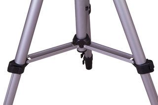 Рефрактор установлен на легкую азимутальную монтировку. Она очень проста в управлении: телескоп перемещается по вертикальной и горизонтальной осям с помощью специальной ручки. В комплекте идет легкая и прочная алюминиевая тренога. Ее высоту удобно регулировать в пределах от 40 до 125 см. Телескоп можно точно настроить по росту наблюдателя и установить даже на столе или на подоконнике.