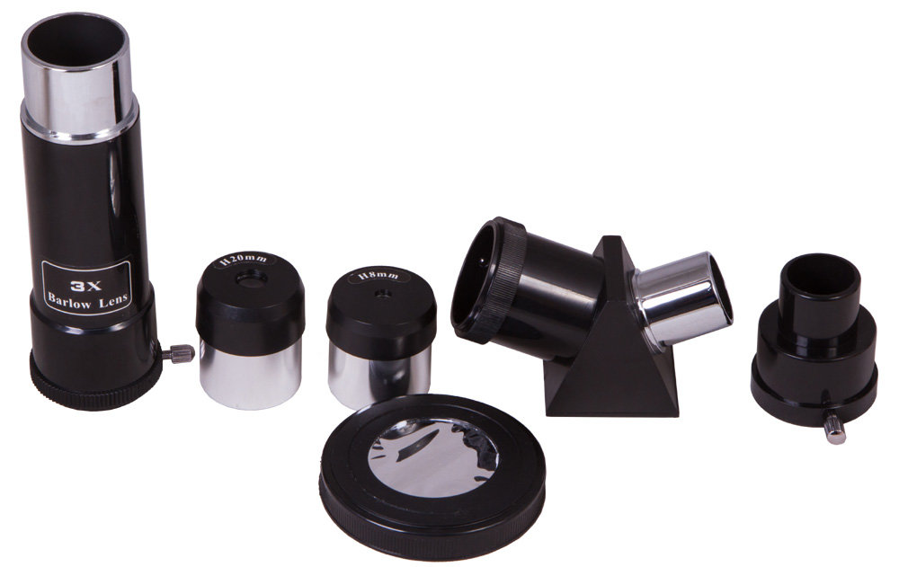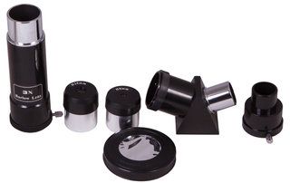 Линзы телескопа сделаны из качественного оптического стекла с полным многослойным просветлением. В комплект входят все необходимые аксессуары: два окуляра с увеличением 18 и 45 крат, 3-кратная линза Барлоу, диагональная призма и солнечный фильтр. Со штатными окулярами и линзой Барлоу можно получить увеличение 135x. На трубу телескопа крепится оптический искатель 2x (в комплекте). Максимальное полезное увеличение составляет 100x.