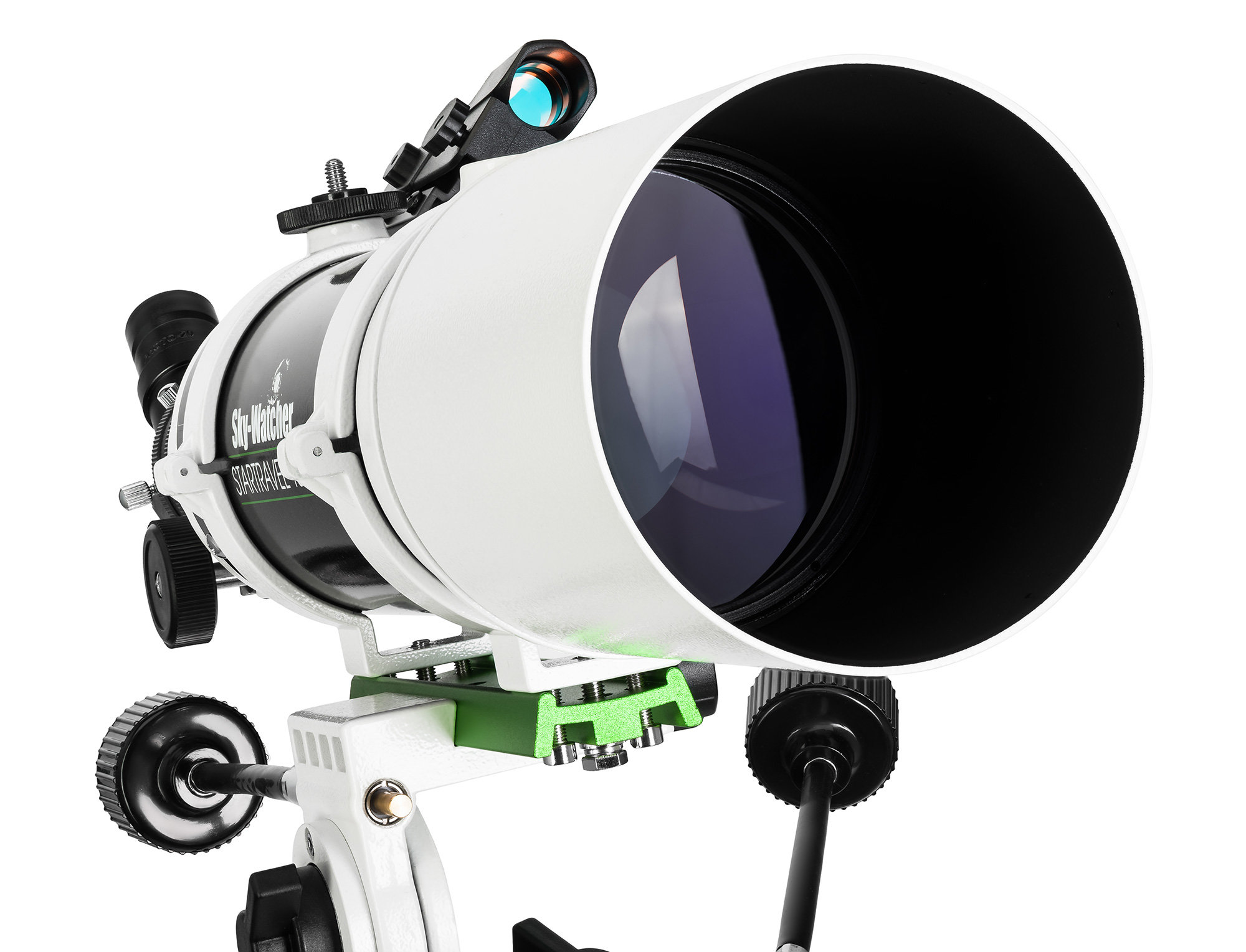 В комплекте с телескопом поставляется азимутальная монтировка AZ PRONTO, укомплектованная штативом-треногой Star Adventurer. Управление монтировкой производится вручную, мелкие перемещения инструмента осуществляются и контролируются через ручки тонких движений (2 штуки в комплекте, для движений монтировки по азимуту и высоте). AZ PRONTO имеет жесткую конструкцию, устойчивую к возникновению вибраций и колебаний, мешающих наблюдениям или астрофотосъемке на длинной выдержке. Для дополнительной страховки от люфтов и смещений в головке монтировки предусмотрены стопорные винты, фиксирующие выбранное положение инструмента. Грузоподъемность монтировки – 3 кг, во избежание поломки оборудования превышать этот показатель строго не рекомендуется.