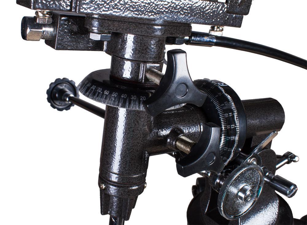 Экваториальная монтировка EQ2 оснащена механизмами тонких движений. Для максимально плавного и ровного хода трубы на ось прямого восхождения можно установить моторный привод (приобретается отдельно). Алюминиевая тренога снабжена лотком для аксессуаров. Высоту ножек можно отрегулировать под рост пользователя.