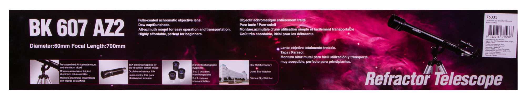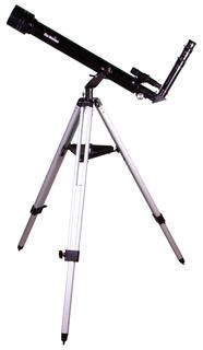 Телескоп собран по схеме рефрактора из ахроматических элементов, поэтому передает четкую и контрастную картинку без цветовых искажений. В комплектацию включено множество аксессуаров, которые позволят приступить к наблюдениям незамедлительно: это окуляры, линза Барлоу, оптический искатель и диагональное зеркало. Дополнительные приобретения не понадобятся.