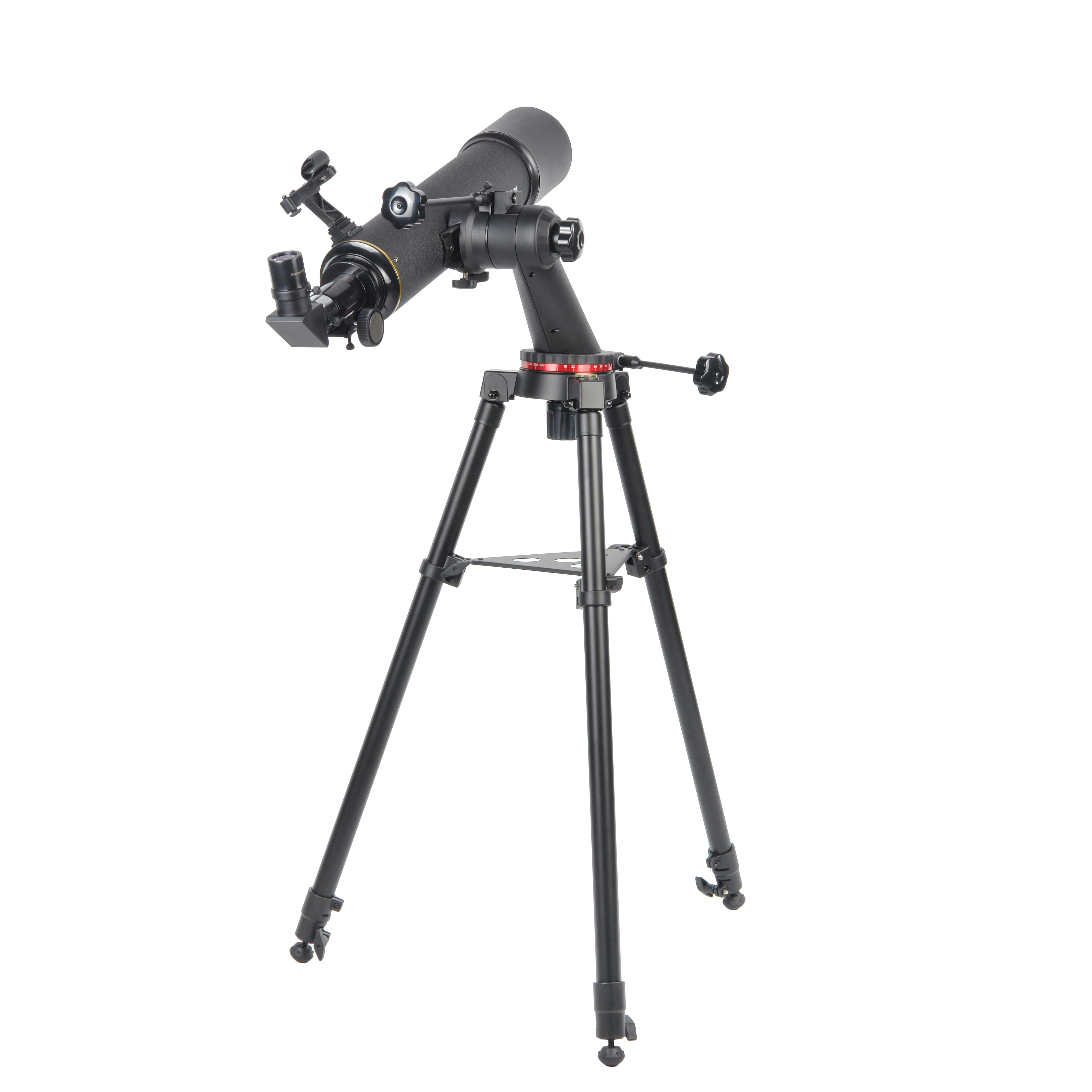 Высота металлического штатива-треноги регулируется от 72 см до 124 см за счет телескопической конструкции с винтовыми фиксаторами. Пластиковые опоры на ножках не позволяют штативу царапать поверхность пола. При использовании телескопа в «полевых» условиях пластиковые опоры выкручиваются вверх и штатив устанавливается на неровную поверхность на «шипах». Для точного выравнивания штатива сверху на корпусе размещен крупный пузырьковый уровень диаметром 25 мм, а для придания устойчивости крепится растяжка с лотком, служащая одновременно полочкой для окуляров.