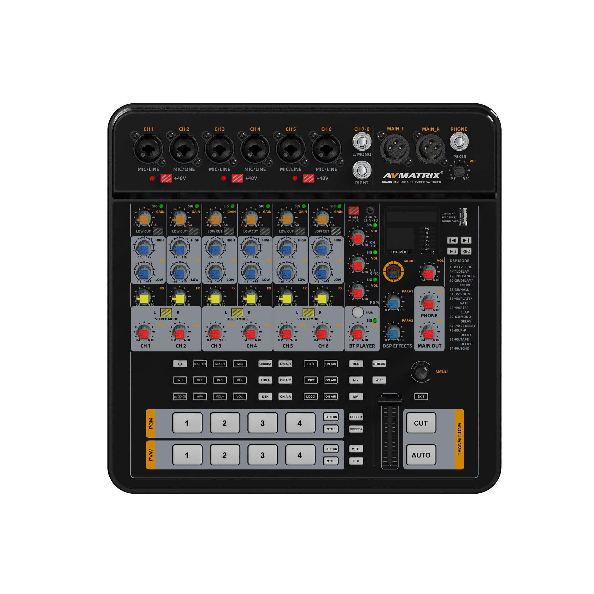 Микшер AVMATRIX Shark H4M – универсальный инструмент для профессиональной обработки видео- и аудиоматериала. Компактное устройство совмещает в себе функции аудио- и видеомикшера, имеет простое управление и обеспечивает все необходимое для работы в режиме реального времени. Микшер подходит для проведения прямых трансляций спортивных мероприятий, концертов, лекций, развлекательных программ и т.д.