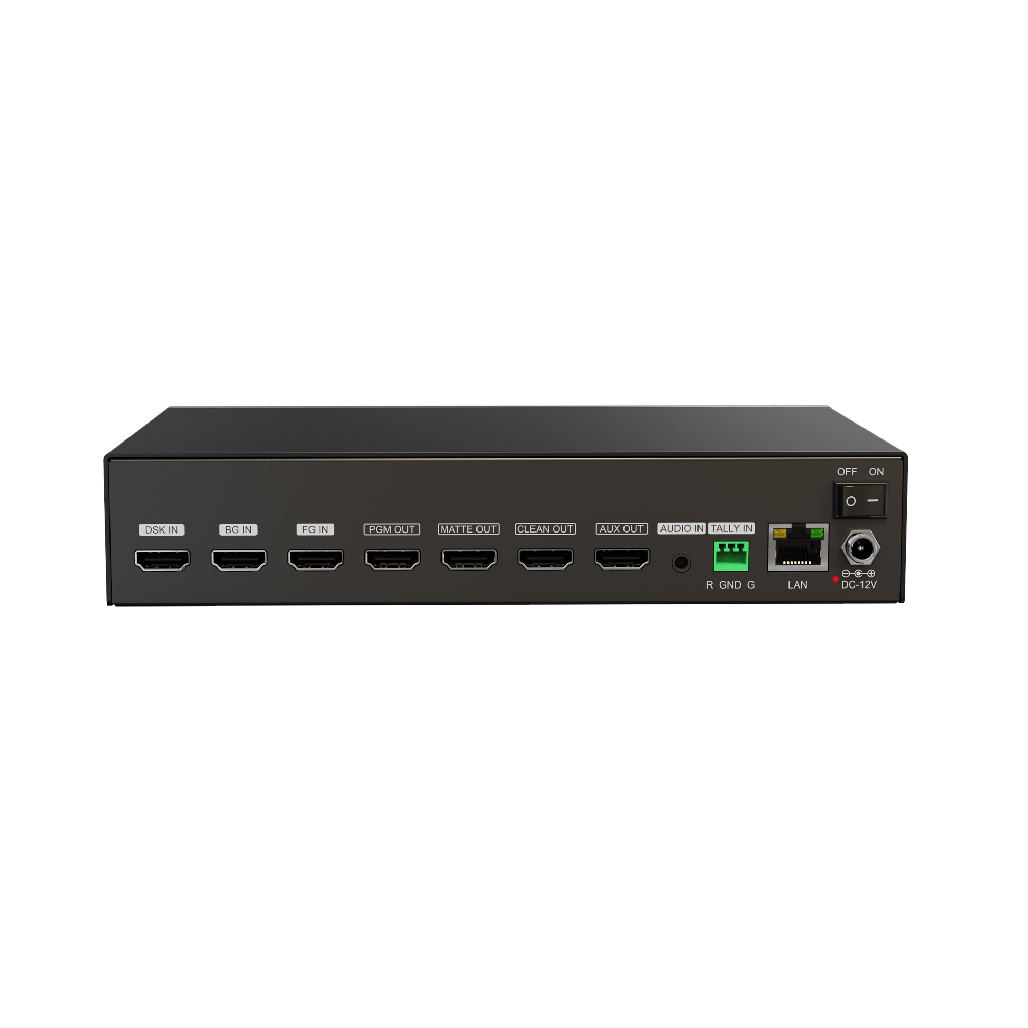 Этот продвинутый хромакей оснащен тремя входами 4K HDMI, для изображений переднего плана (FG), фонового (BG) и источника DSK для гибкой и точной настройки хромакея. Он обеспечивает высококачественный программный вывод 4K HDMI (PGM), а также выходы Matte Out, Clean Out и вспомогательный (AUX), обеспечивая плавное переключение сигналов для удовлетворения различных производственных потребностей.
